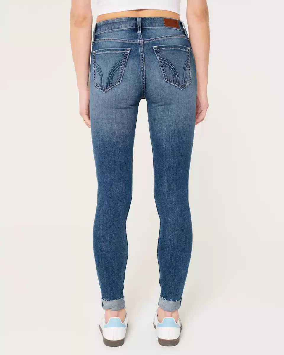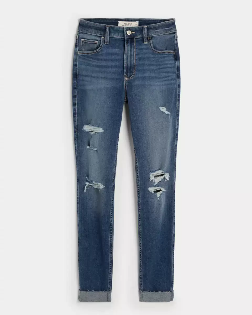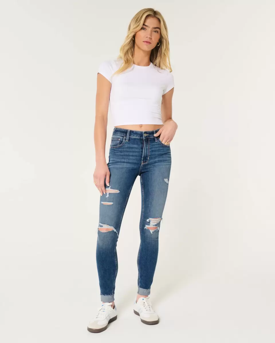 Designed in our signature slim fit, these dark wash super skinny jeans feature fading, whiskering and ripped detailing. High-rise waist, cuffed hems, stretch.