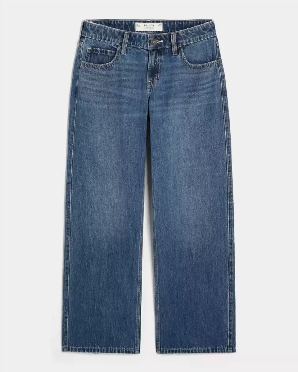 Classic, comfortable jeans designed with a baggy leg. Fading and whiskering, dark wash denim, low-rise waist. Imported.