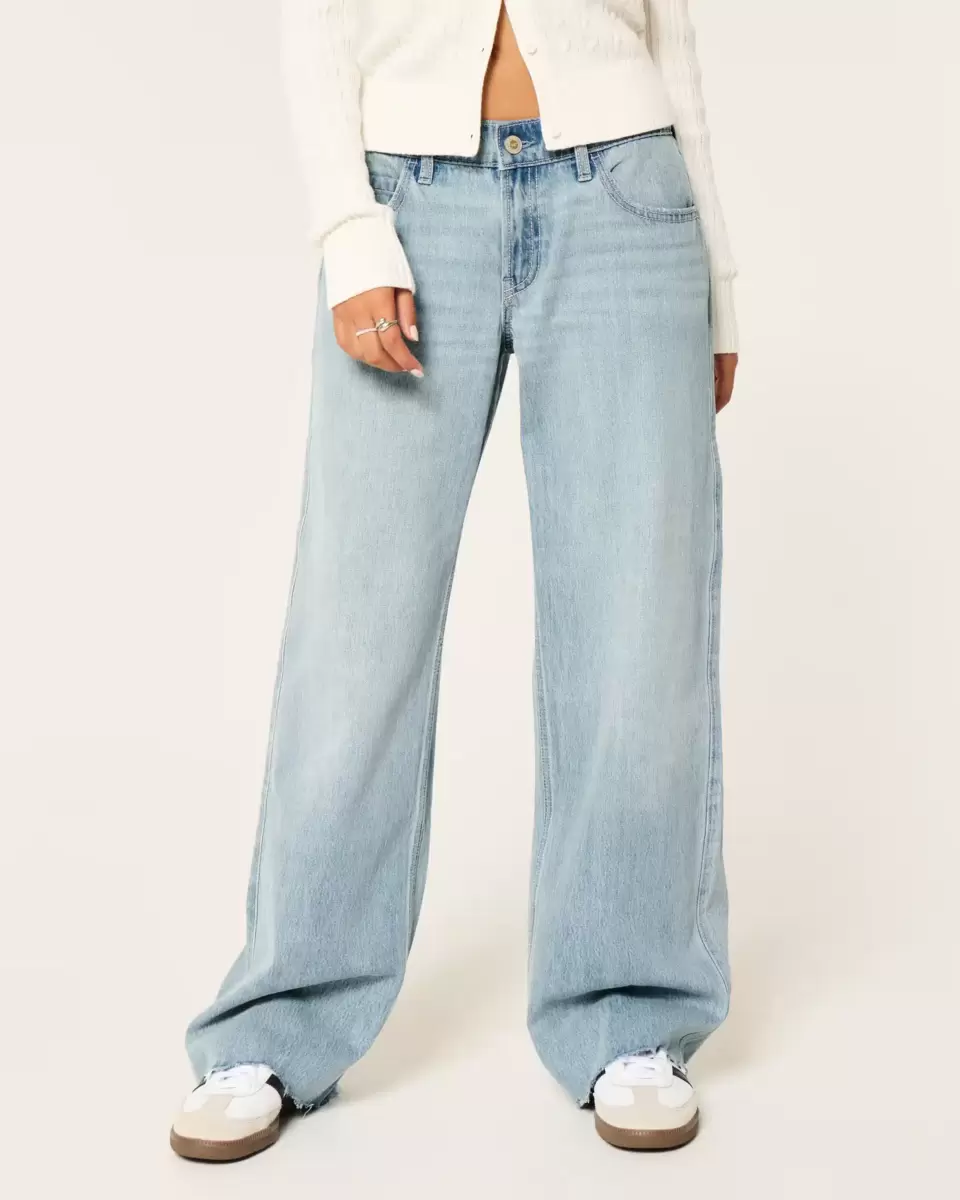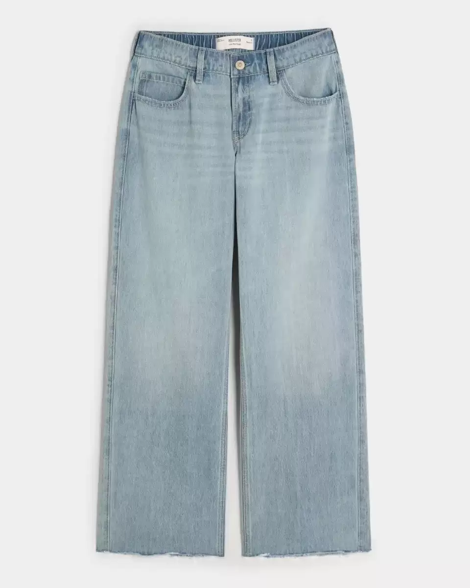 Ultra-comfortable denim jeans in a light wash, designed with a low-rise waist and baggy leg. Comfort waistband, fading, whiskering, raw edged hems. Imported.