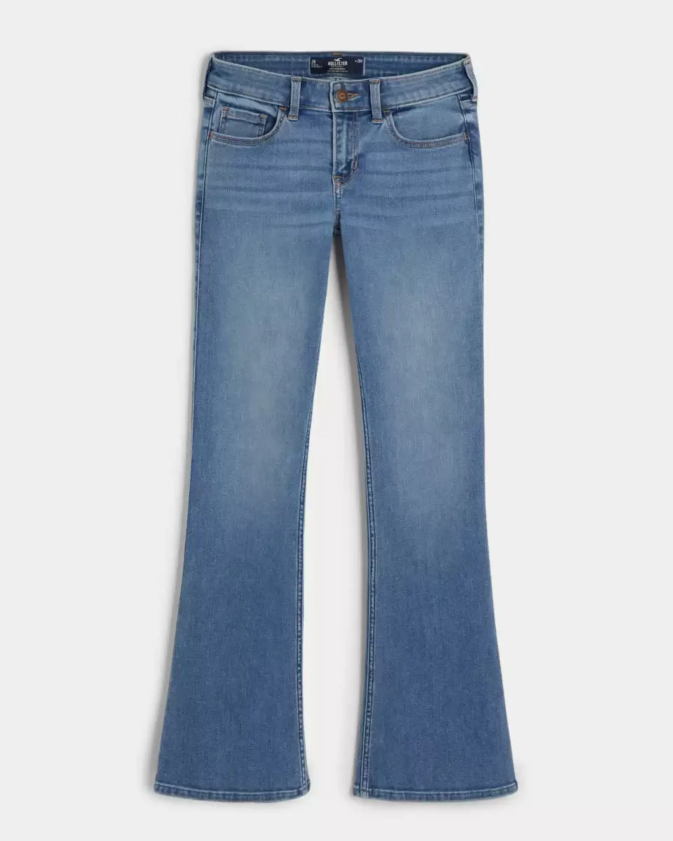 Slim through the thigh with a wider hem below the ankle, these medium wash boot jeans feature a trendy low-rise waist. Fading and whiskering. Imported.