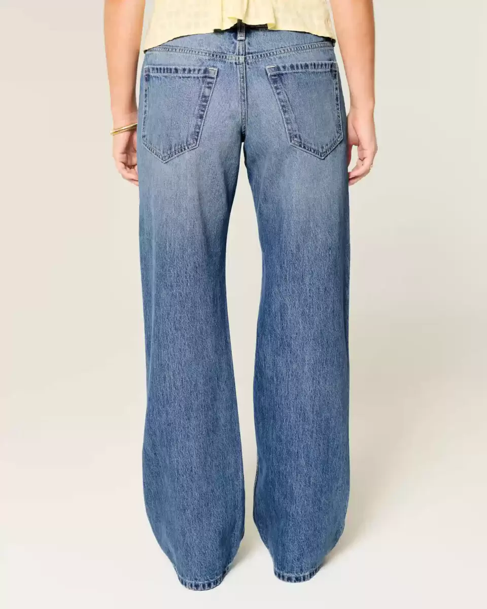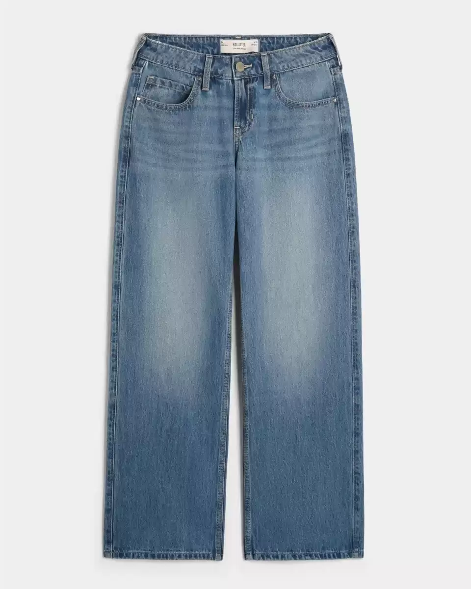 Comfortable denim jeans in a medium wash, designed with a baggy leg and flattering low-rise waist. Cute metal studded heart details, fading, whiskering.
