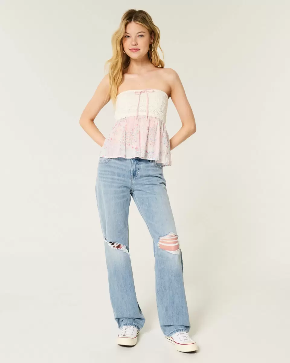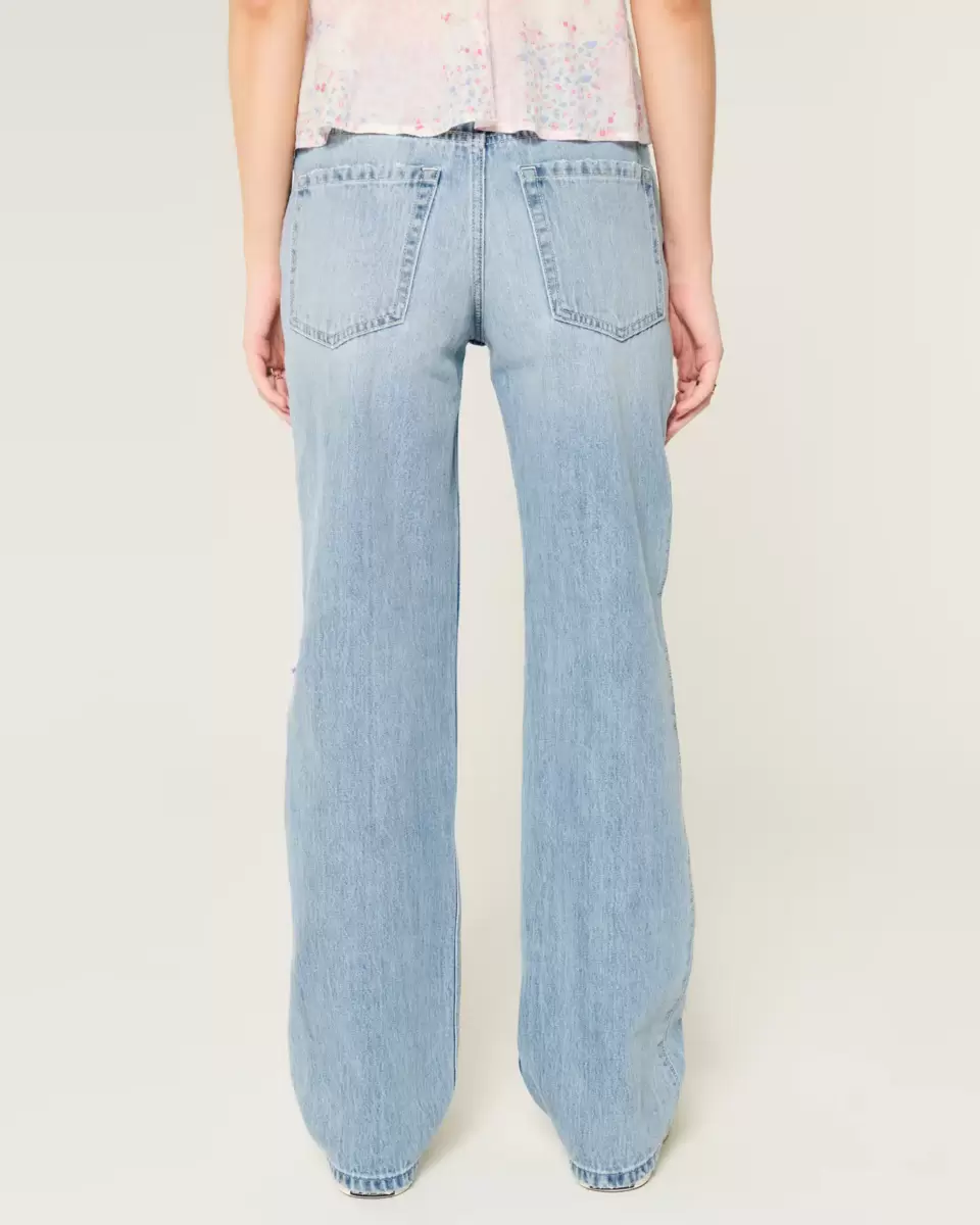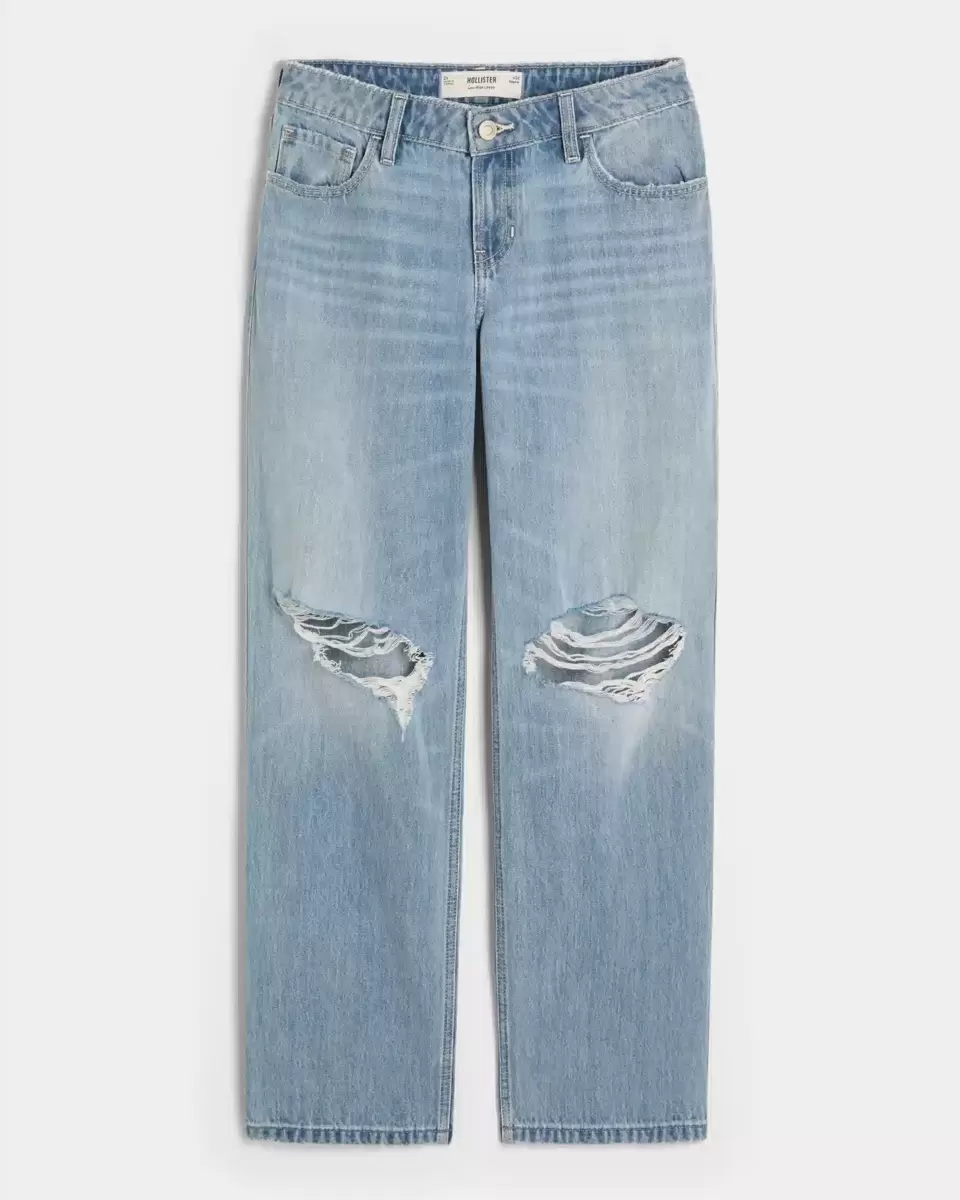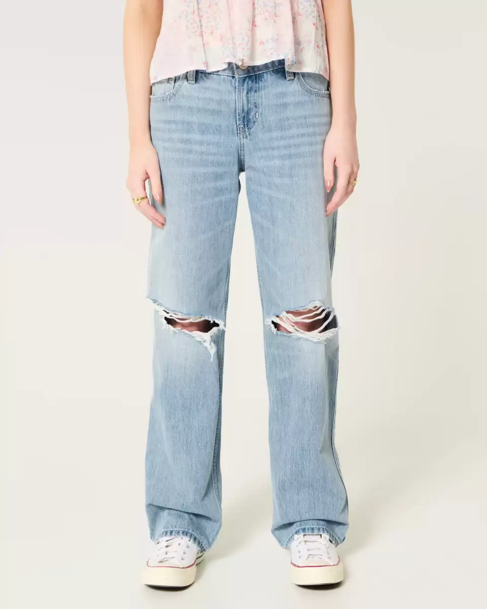 Cute and comfortable denim jeans in a light wash with ripped details, fading and whiskering. Loose leg, low-rise waist. Imported.