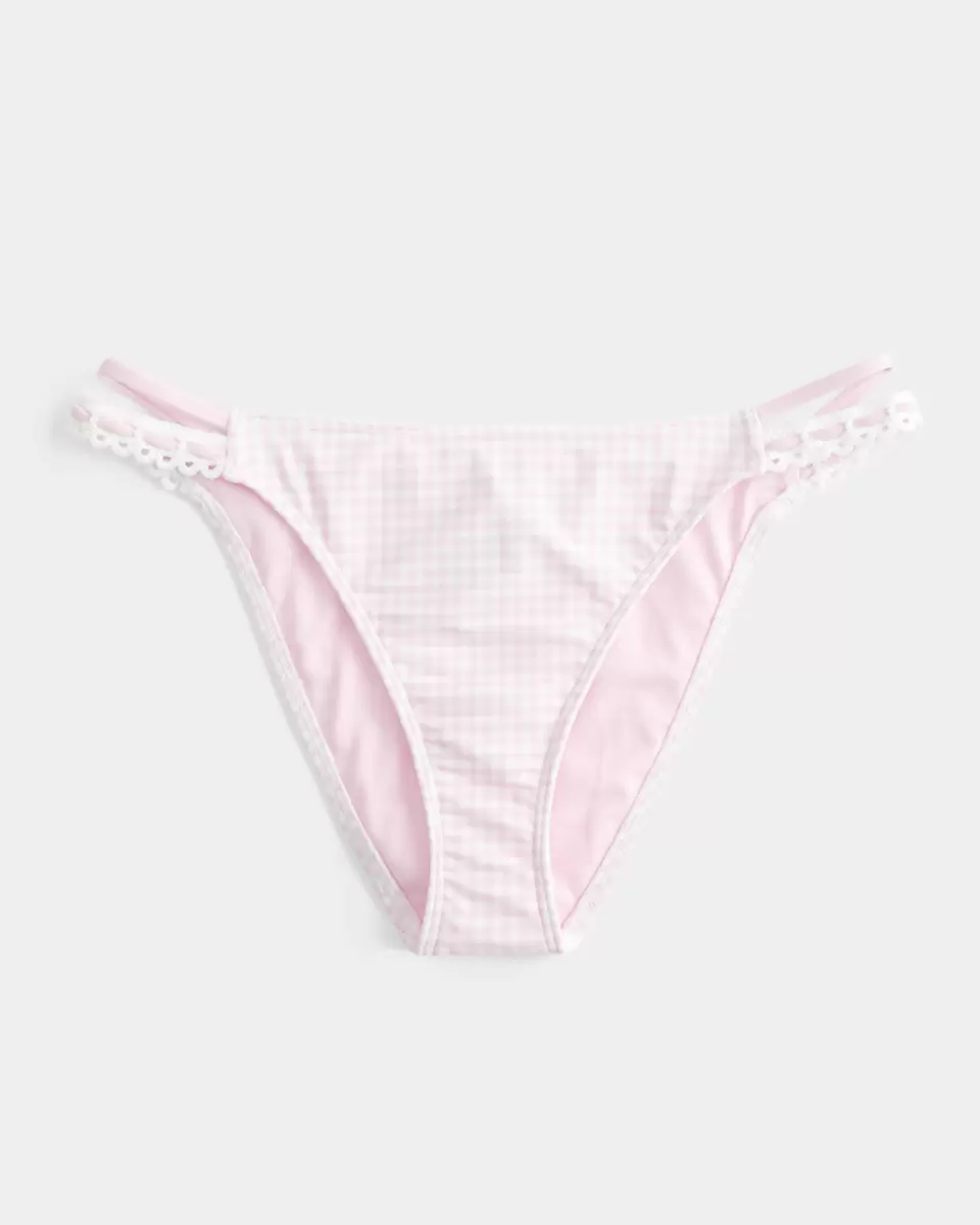 A cute bikini bottom featuring double side straps with crochet-style trim. Cheeky coverage. Imported.