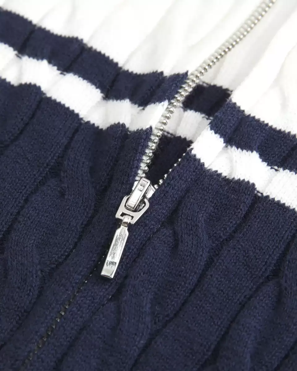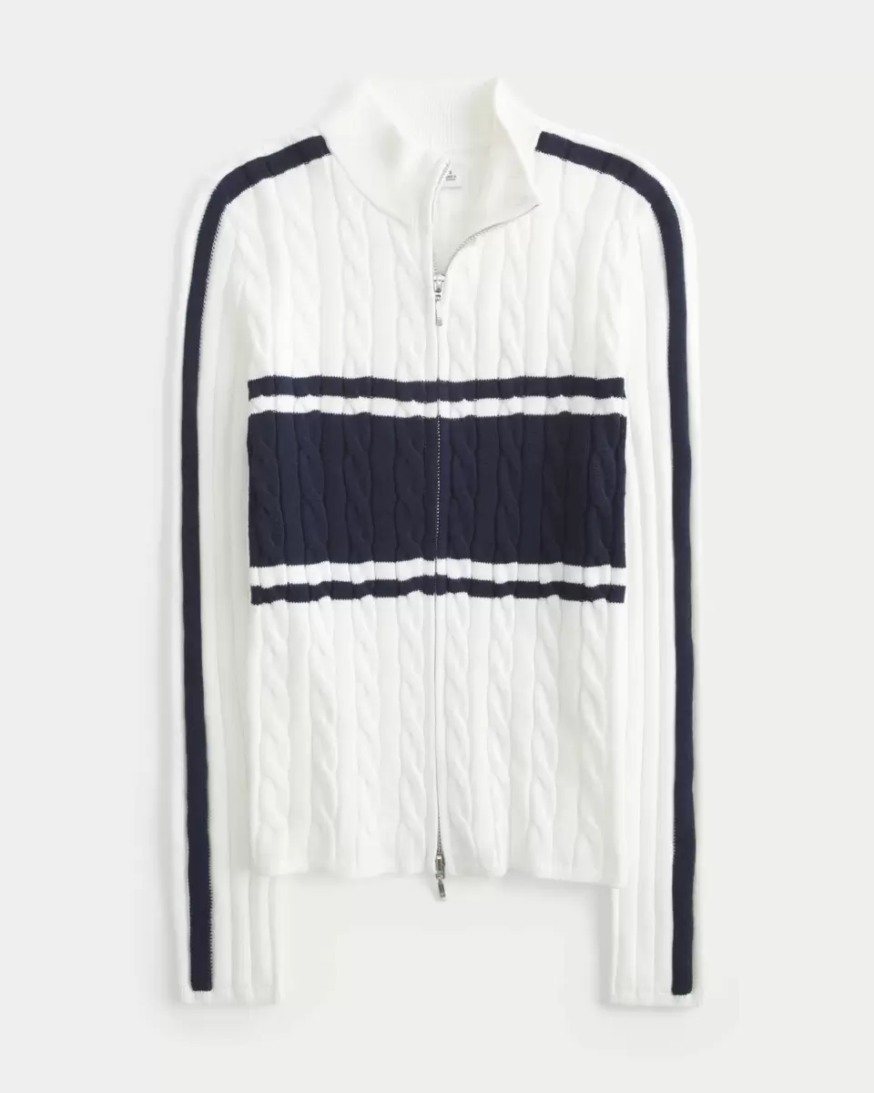 A cozy sweater featuring a cable-knit pattern, foldable mock neck collar, and dual zippers. Long sleeves. Slim Fit. Imported.