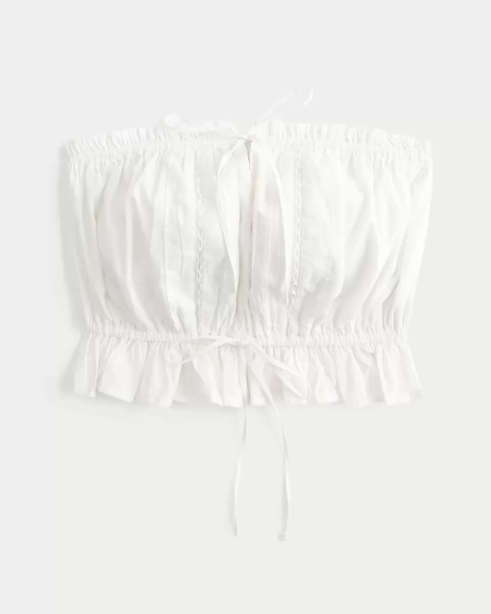 This super soft tube top is perfect for warm, sunny weather! Made with voile fabric, strapless silhouette with ties at the neckline and waist, pretty lace insets, ruffle trims. Easy Fit. Imported.