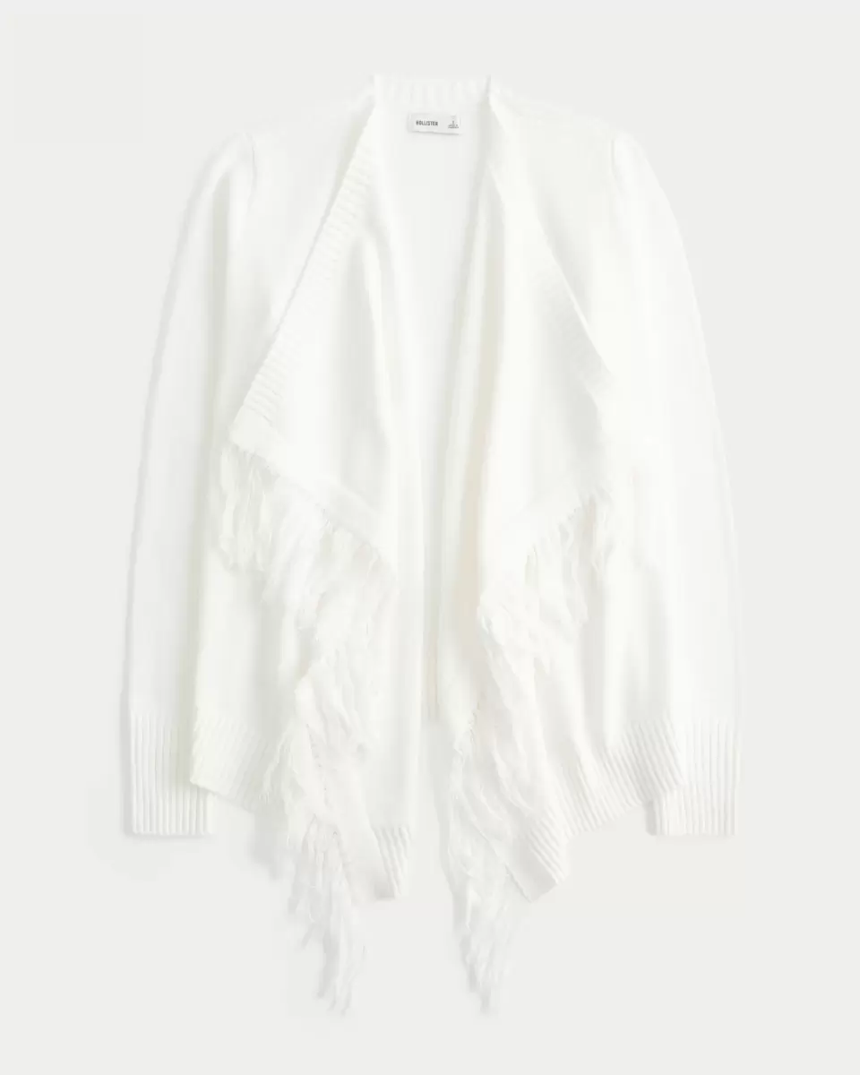 A pretty and super soft cardigan featuring a drapey collar with fringe detailing. No closure, ribbed trims, long sleeves. Easy Fit. Imported.