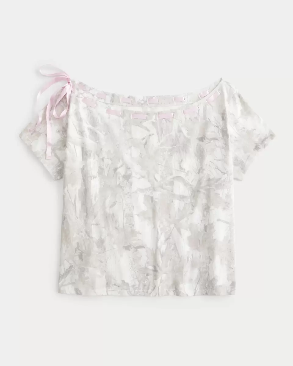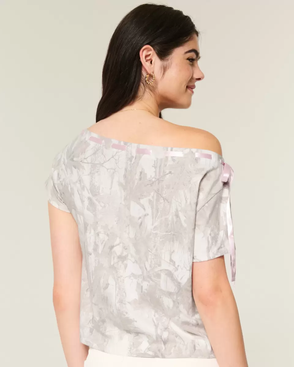 A super soft 100% cotton t-shirt with a pretty tie through the off-the-shoulder neckline. Short sleeves, all-over camo pattern. Easy Fit. Imported.