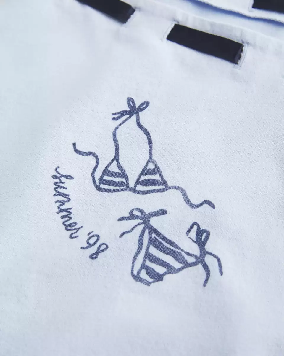 Made with super soft 100% cotton, this t-shirt features an off-the-shoulder neckline with a pretty tie detail. Cute summer bikini graphic, short sleeves. Easy Fit.