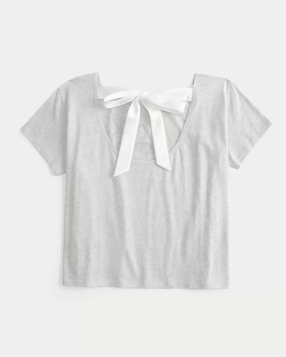 Cute and super soft, this tee features New York print graphics and a ribbon back tie detail. Short sleeves. Easy Fit. Imported.