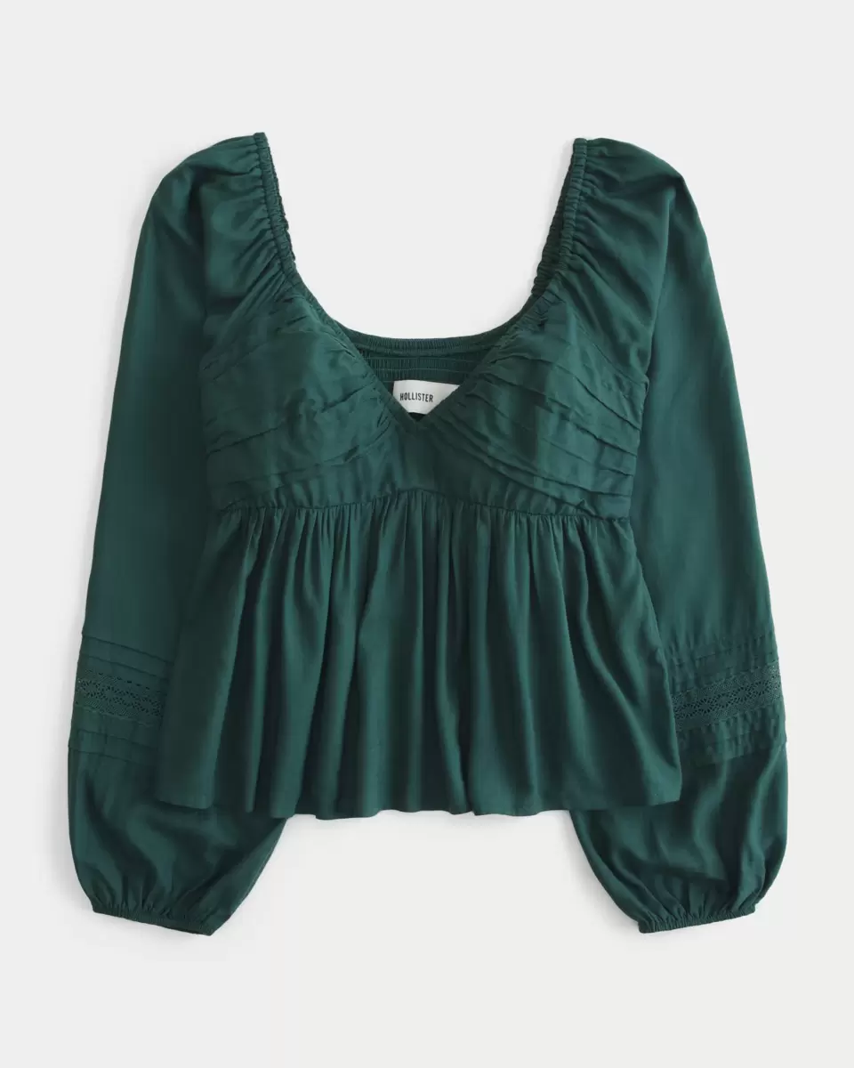 A pretty and super soft top designed with a babydoll silhouette, ruched detailing through the bust and lace insets at the sleeves. Soft smocked back, long sleeves. Easy Fit.