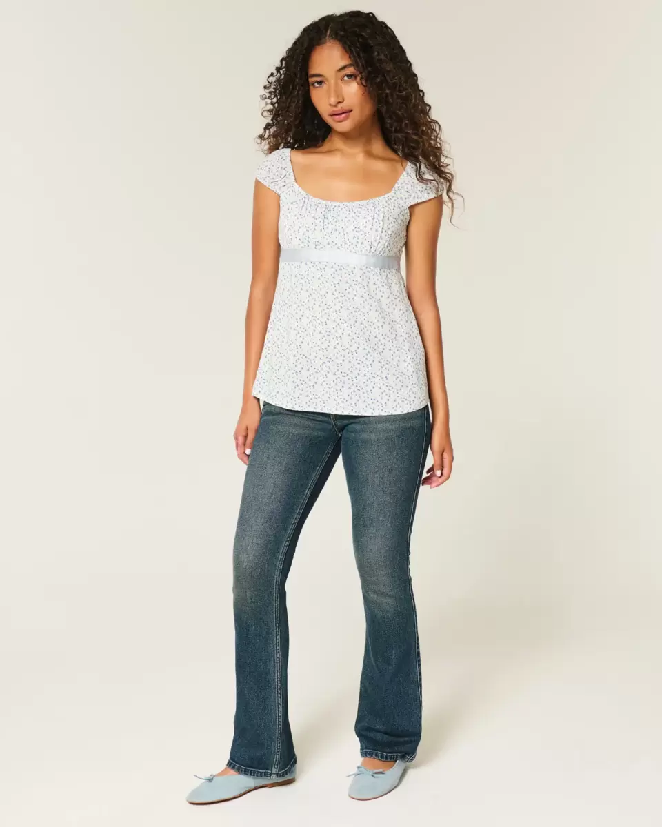 A flowy and super soft babydoll top featuring a pretty satin tie detail. Ruched detailing through the bust, soft smocked back. Easy Fit.