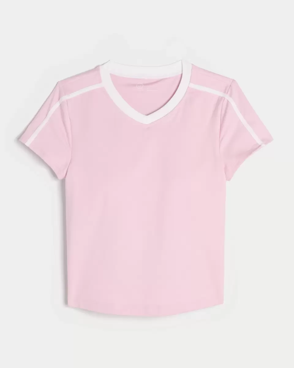 This super soft and comfy baby tee features a v-neckline and sporty stripe along the sleeves. Short sleeves, built-in shelf bra with removable pads.