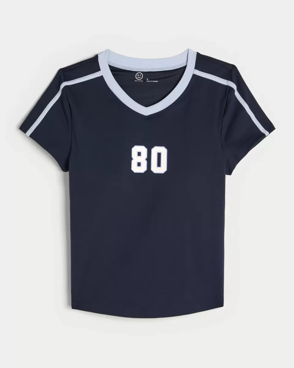 This super soft and comfy baby tee features a sporty print graphic and v-neckline. Short sleeves, built-in shelf bra with removable pads. Imported.
