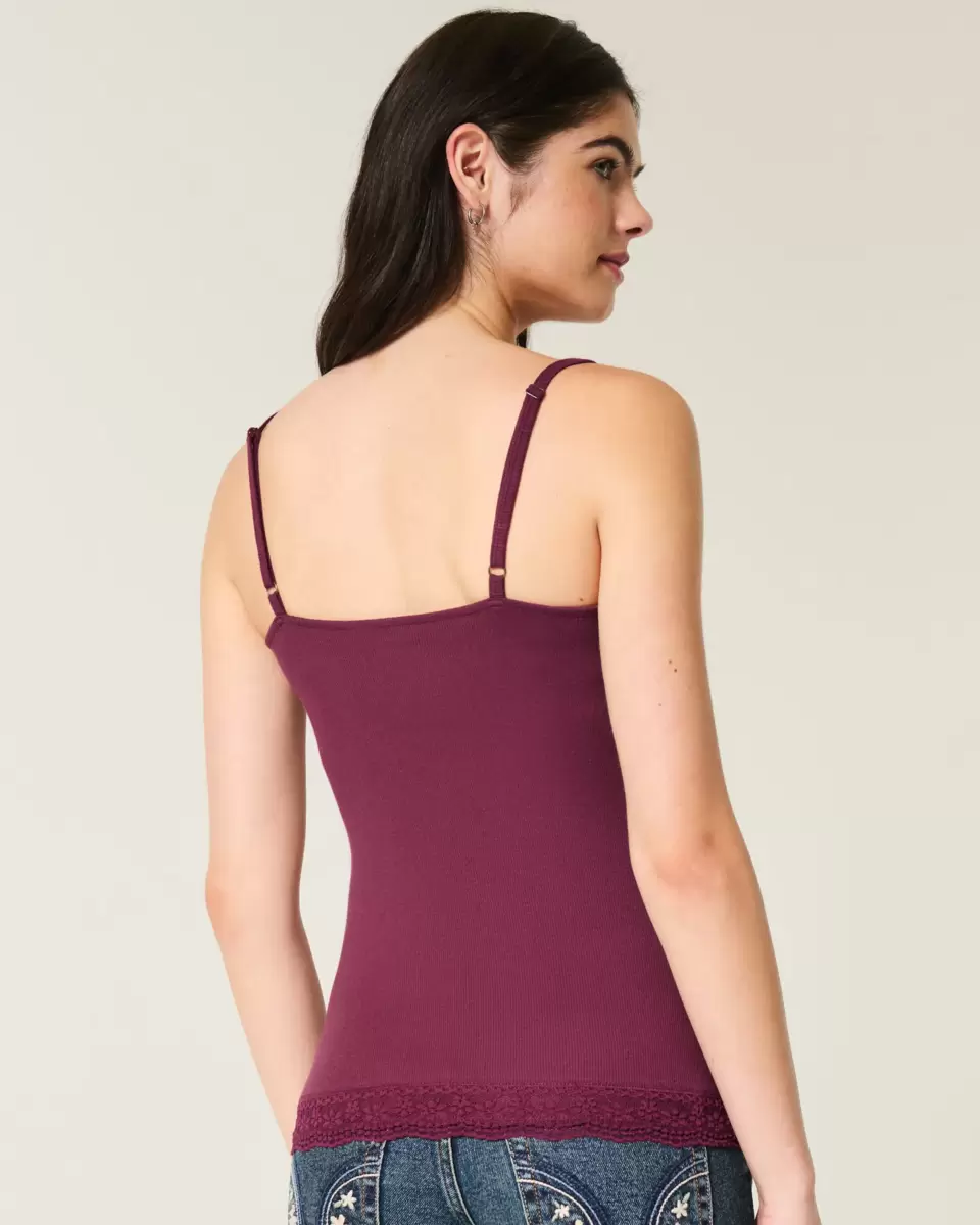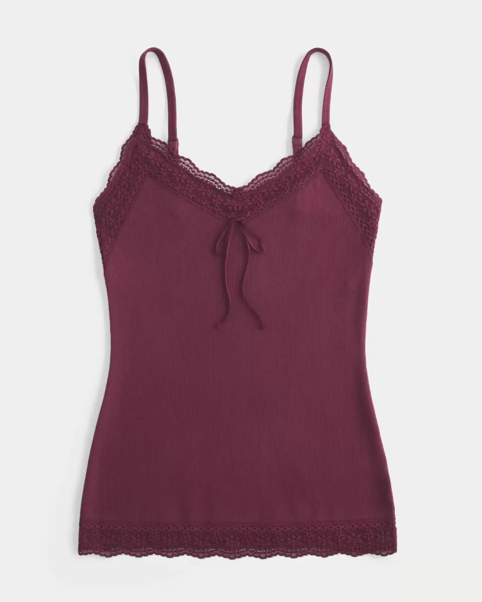 Pretty and super soft, this Y2K-inspired cami features lace trim at the neckline and hem, plus a bow detail at the center neckline. Adjustable straps. Slim Fit. Imported.
