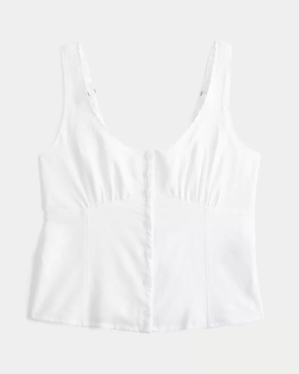 This pretty blouse features pretty embroidered detailing and scalloped trim along the straps, a scoop neckline and button-through closure. Soft smocked back. Slim Fit. Imported.