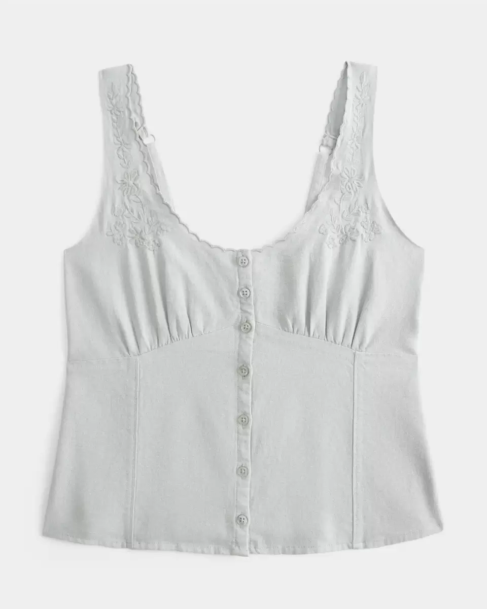 This pretty blouse features pretty embroidered detailing and scalloped trim along the straps, a scoop neckline and button-through closure. Soft smocked back. Slim Fit.
