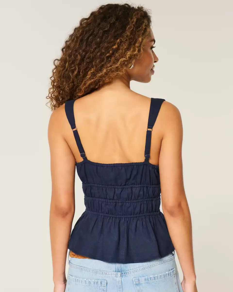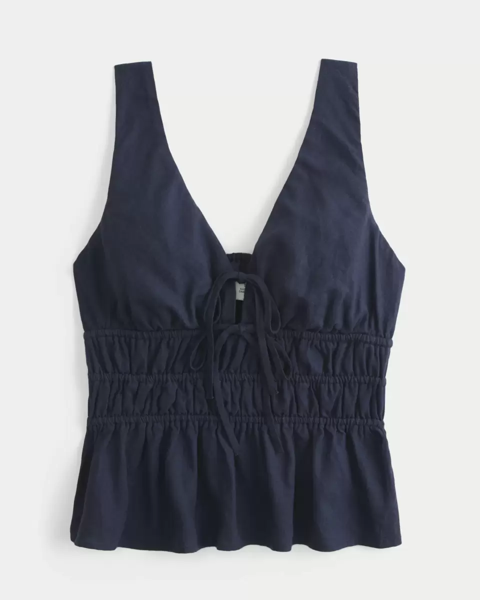 A cute peplum top in a soft linen blend, featuring a front tie detail and channeling through the waist. V-neckline. Slim Fit. Imported.