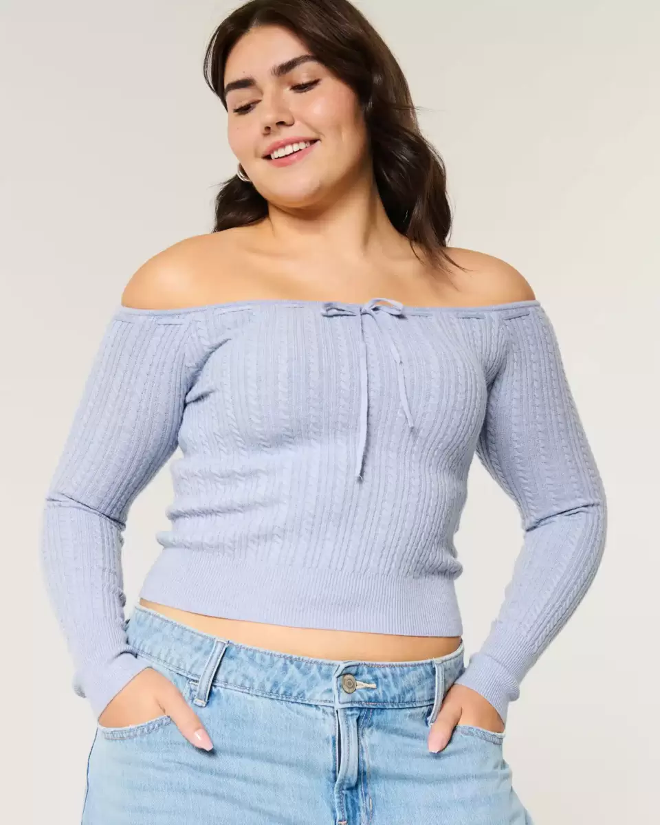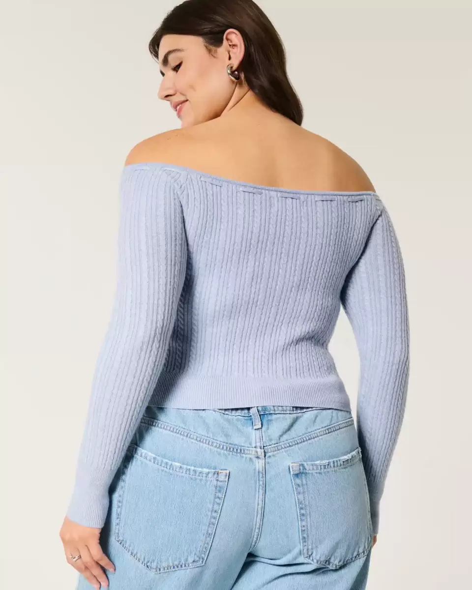 Cute and cozy, this super soft sweater features cable-knit patterns and an off-the-shoulder neckline with passementerie detail. Long sleeves, ribbed trims. Slim Fit.