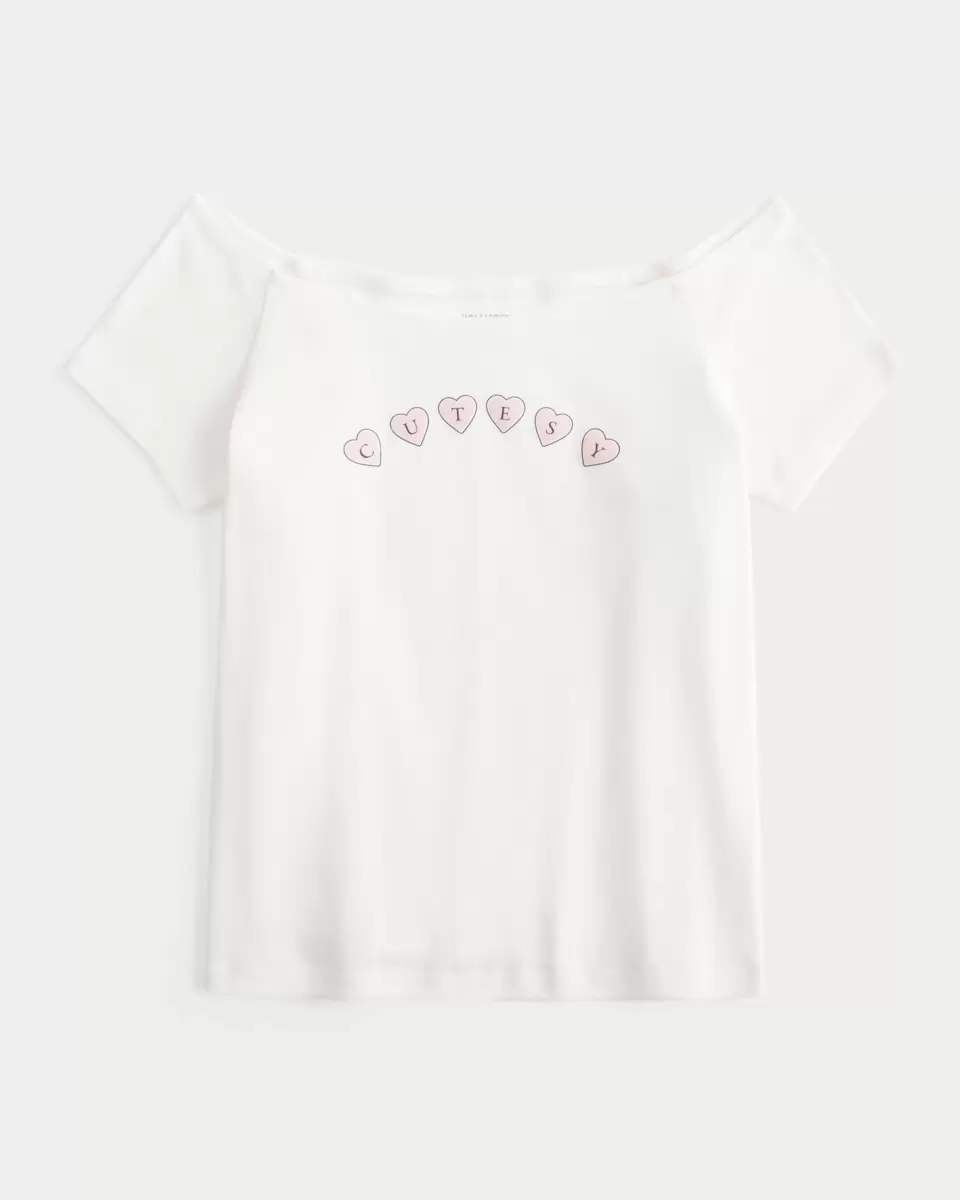 Comfy and super soft, this tee features Cutesy heart print graphics and an off-the-shoulder neckline. Short sleeves. Slim Fit.
