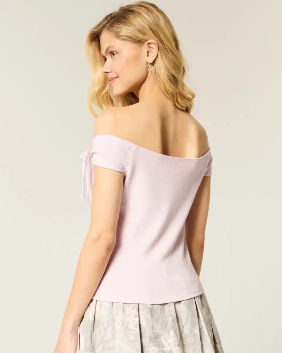 A super soft and cute top with an off-the-shoulder neckline and tie details. Slim Fit. Imported.