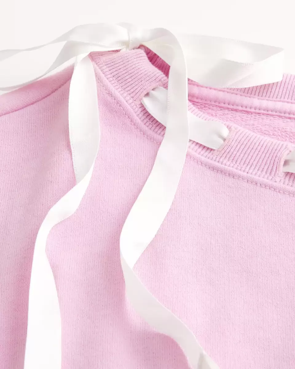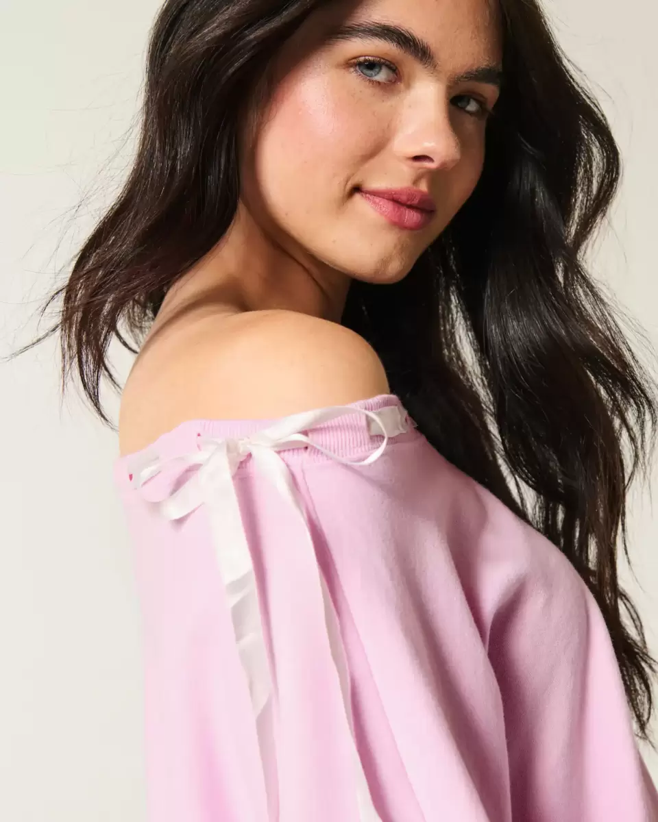 This super soft sweatshirt features an off-the-shoulder neckline with a pretty tie detail. Long sleeves. Imported.