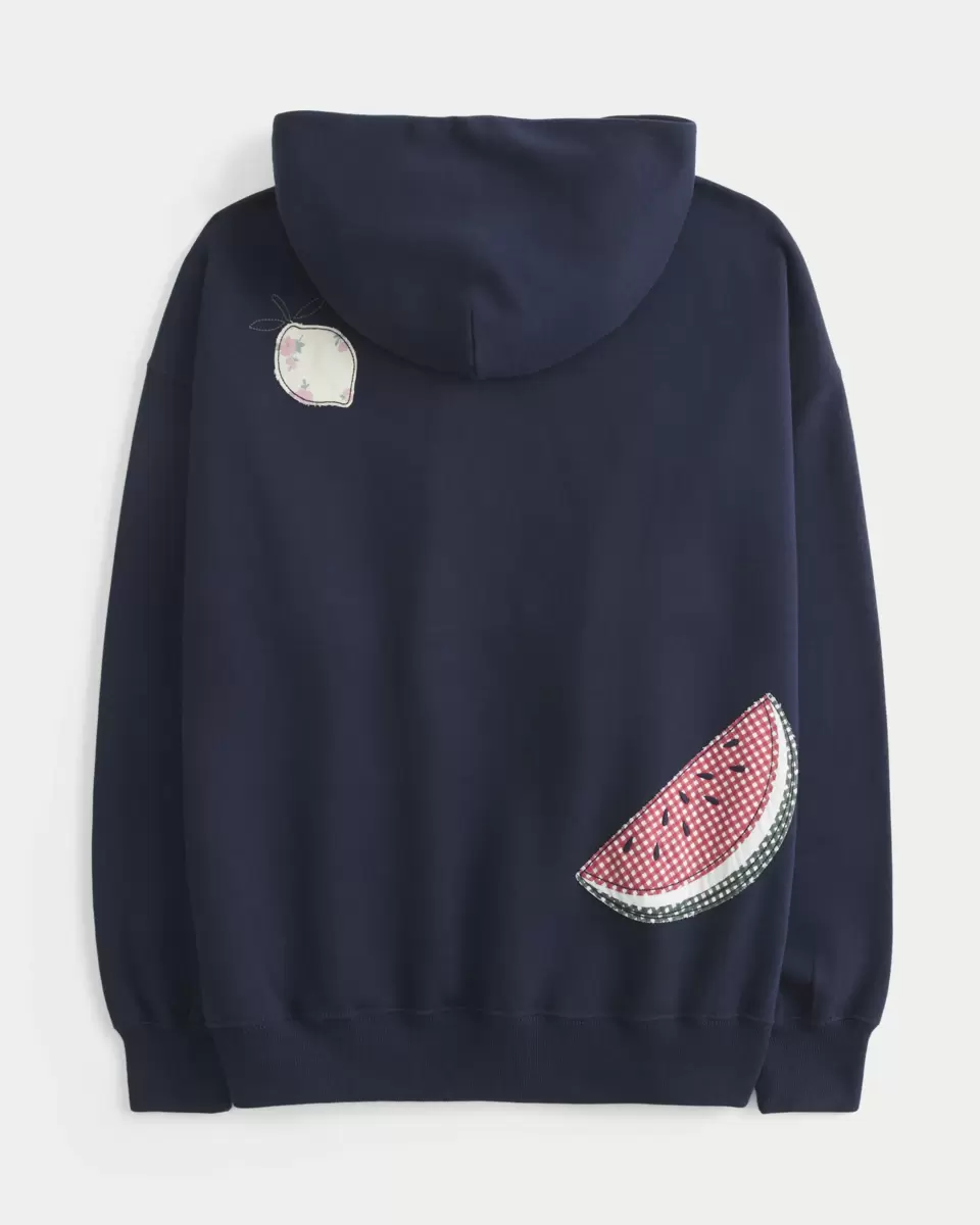 A super soft fleece hoodie featuring fruit graphic applique at the back and hood. Long sleeves, front pouch pocket. Oversized Fit. Imported.