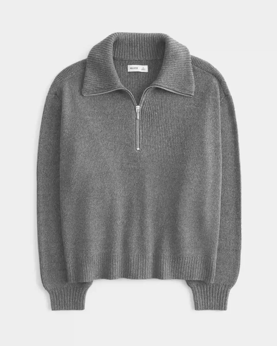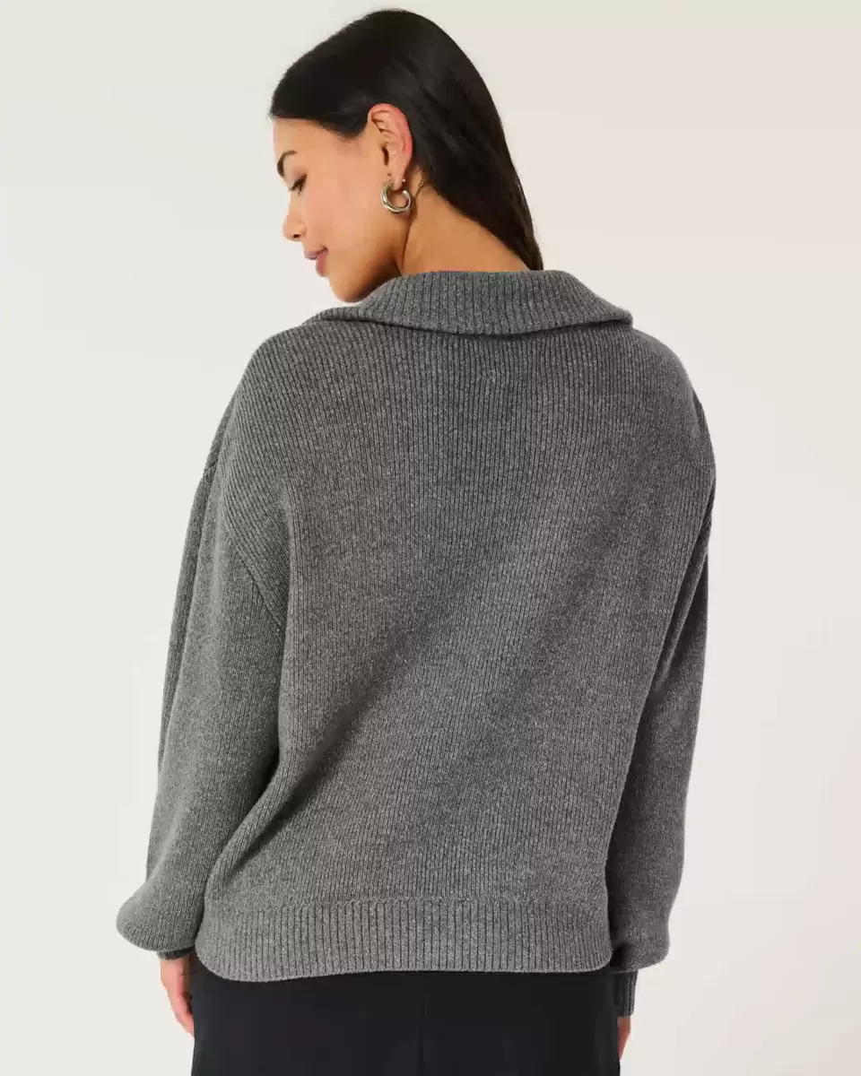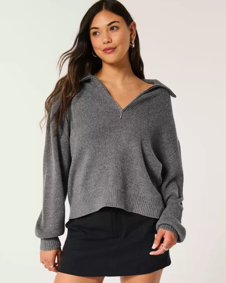 Cute and cozy, this sweater features a collar with half-zip placket, long sleeves and ribbed trims. Oversized Fit. Imported.