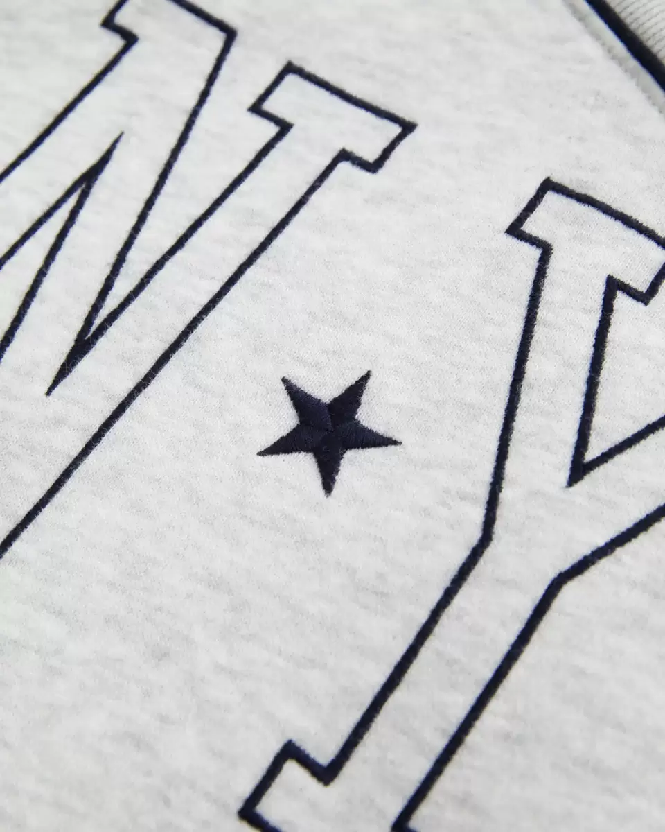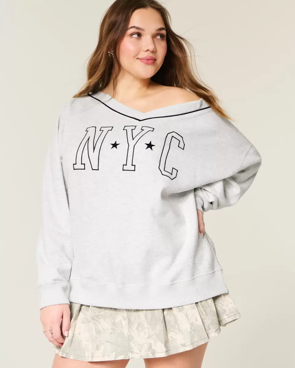 This comfy and super soft fleece sweatshirt features NYC graphic embroidery and an off-the-shoulder v-neckline. Long sleeves. Oversized Fit.