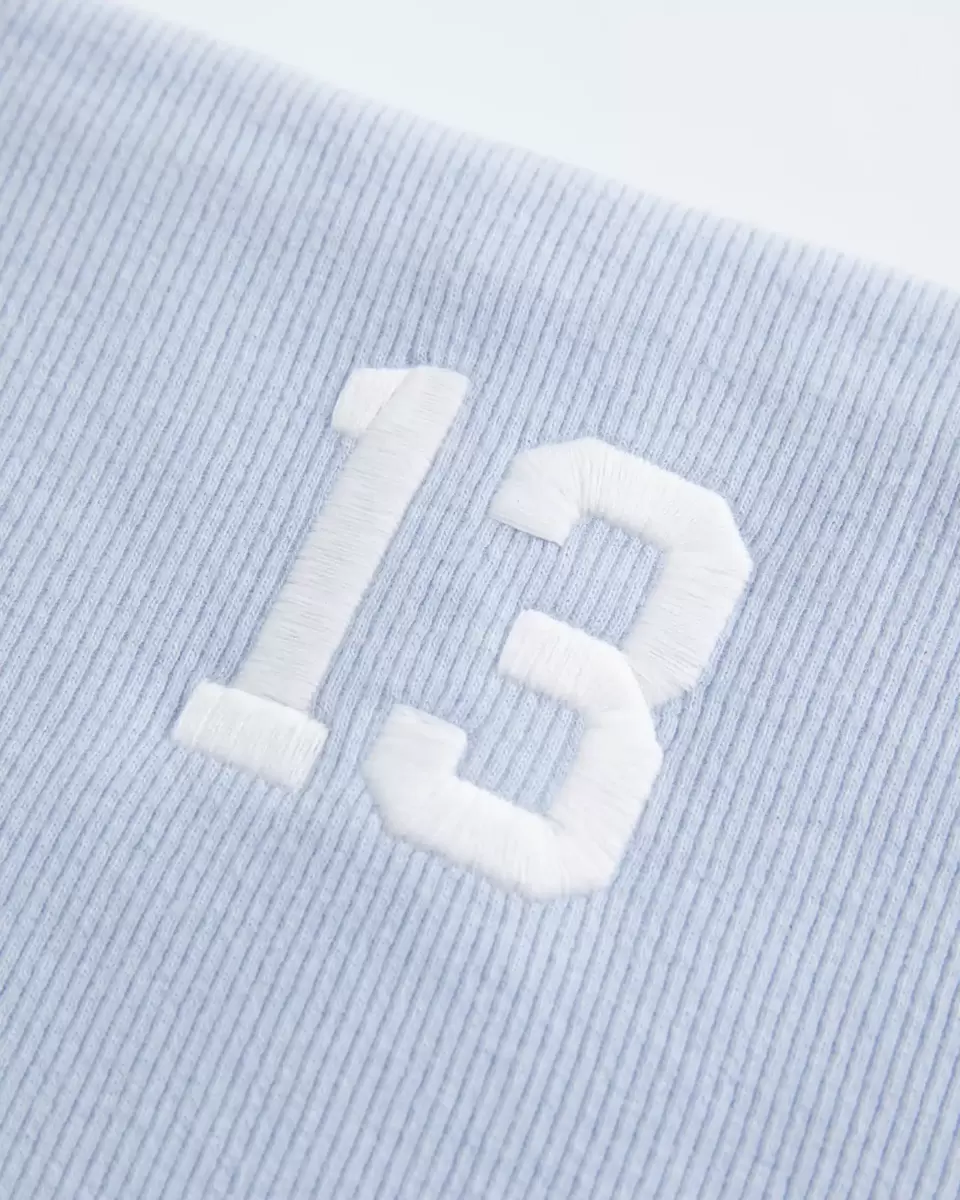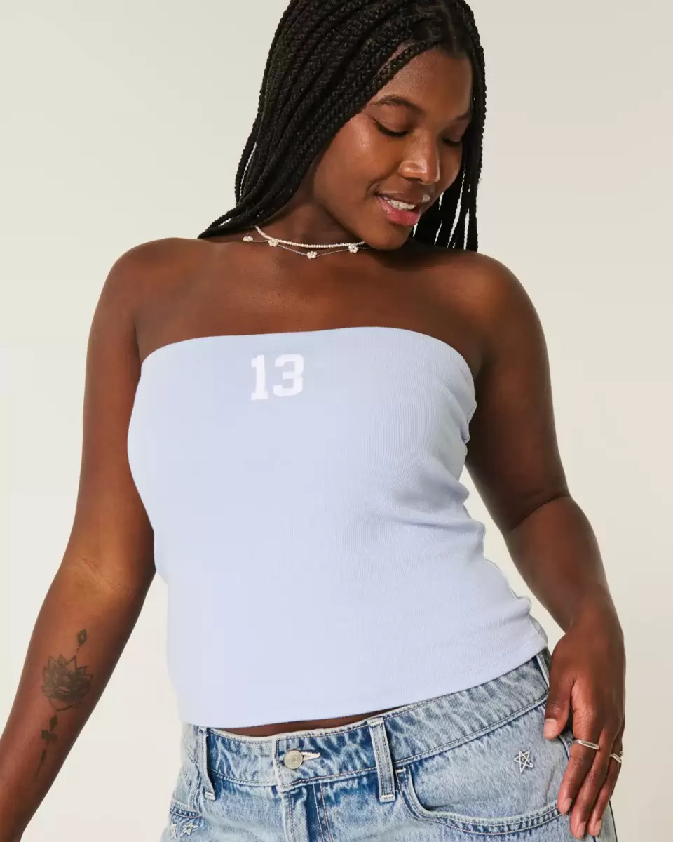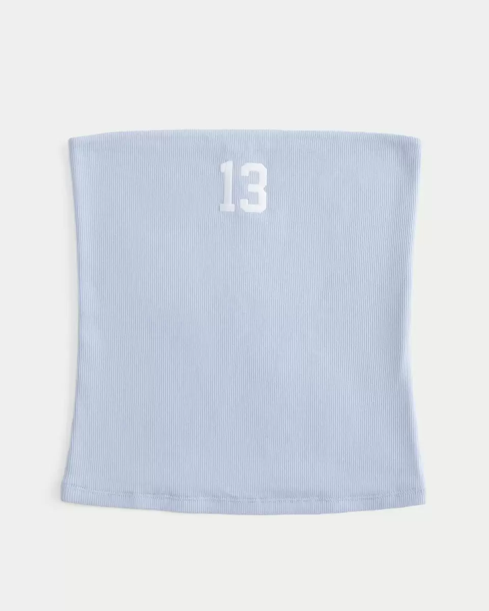 A super soft tube top in ribbed fabric, featuring an embroidered number graphic. Strapless. Slim Fit. Imported.