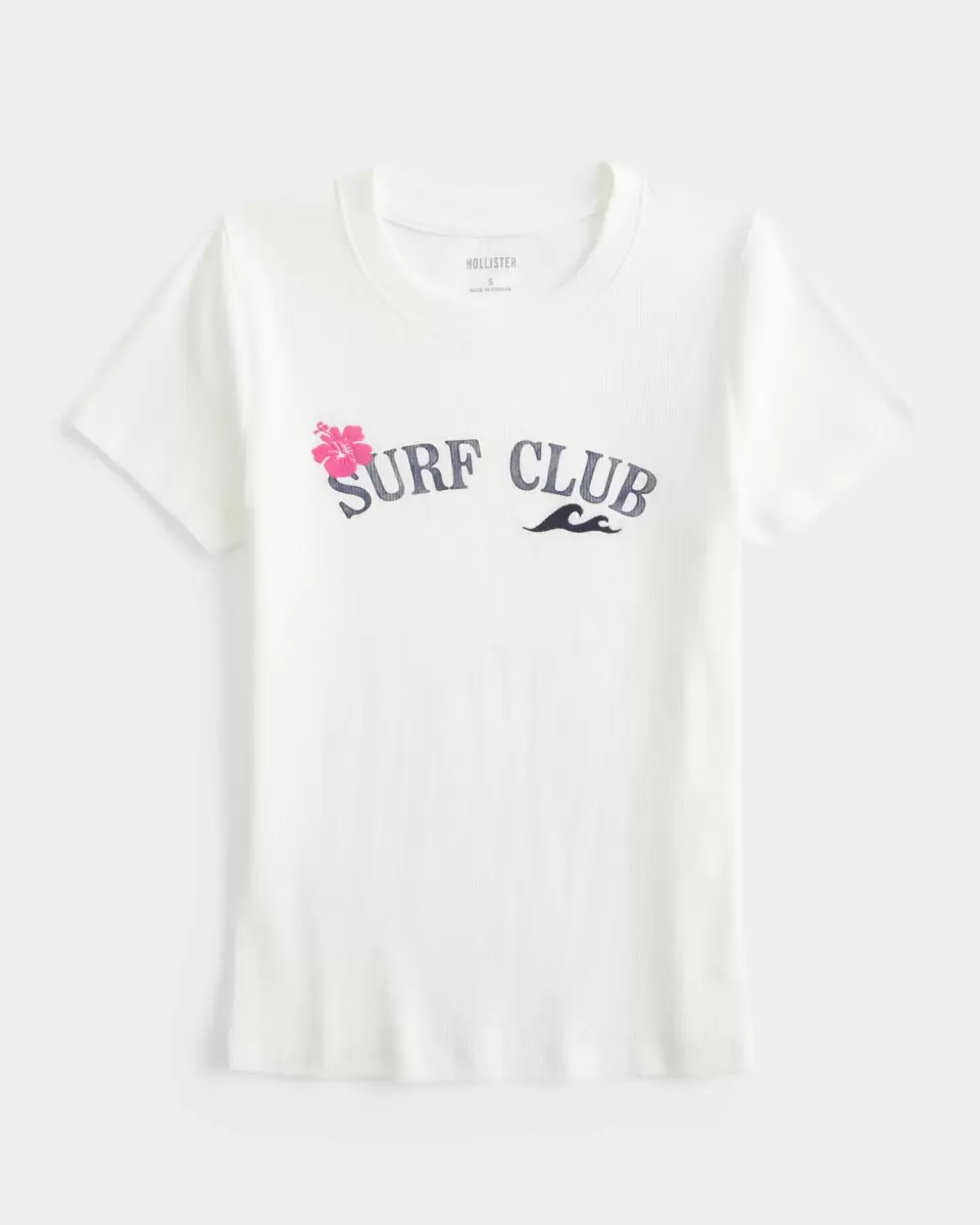 A cute and comfy Y2K-inspired baby tee in super soft ribbed fabric, featuring Surf Club print graphics. Crew neckline, short sleeves, slightly shrunken silhouette. Slim Fit. Imported.