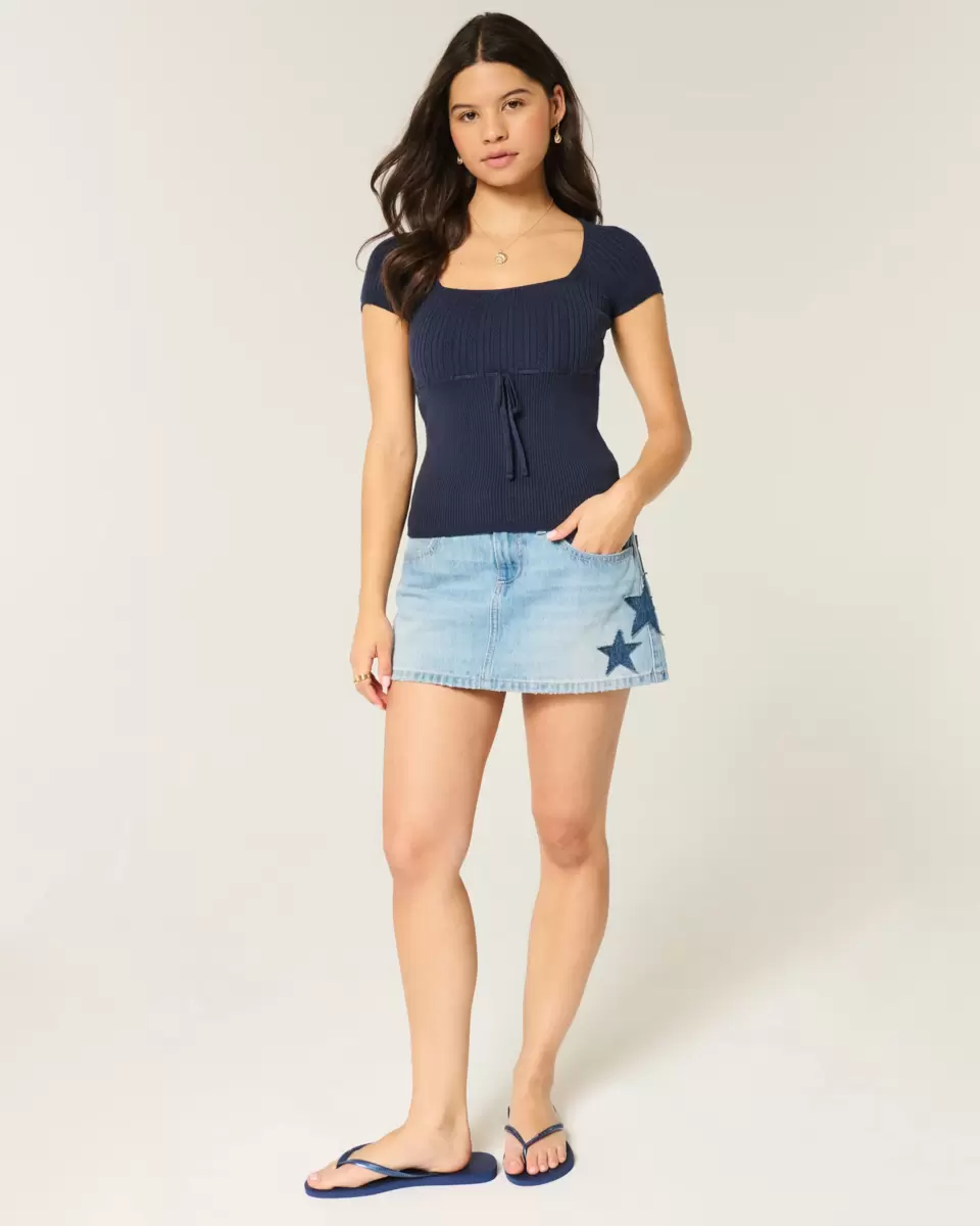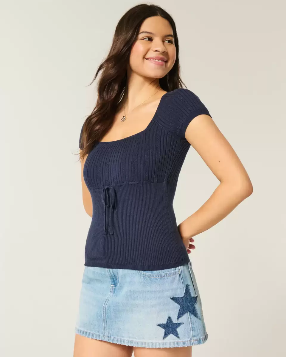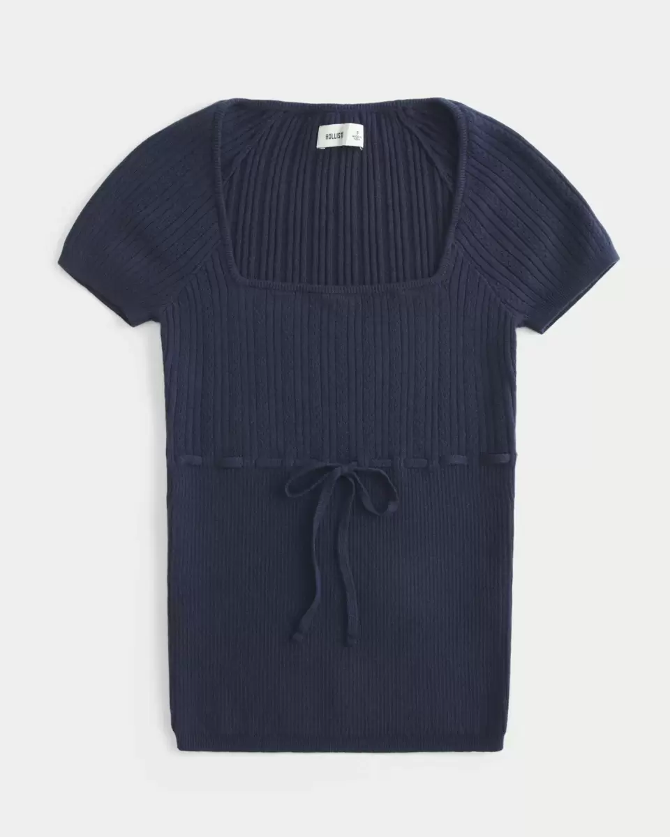 Cute and super soft, this short-sleeve sweater features ribbed texture and a tie detail through the waist. Square neckline.