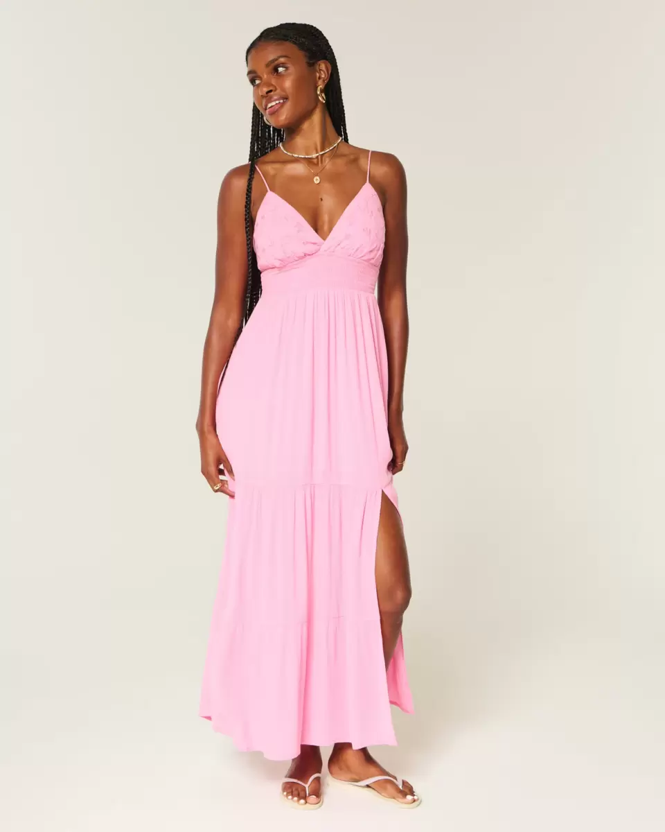 This pretty and super soft maxi-length dress features embroidered details at the bust. Split hem detail, adjustable straps, soft smocked waist. Imported.