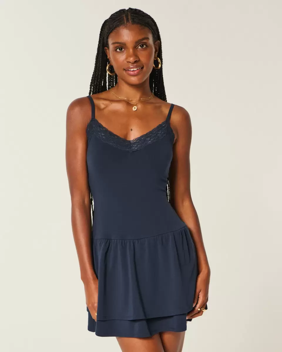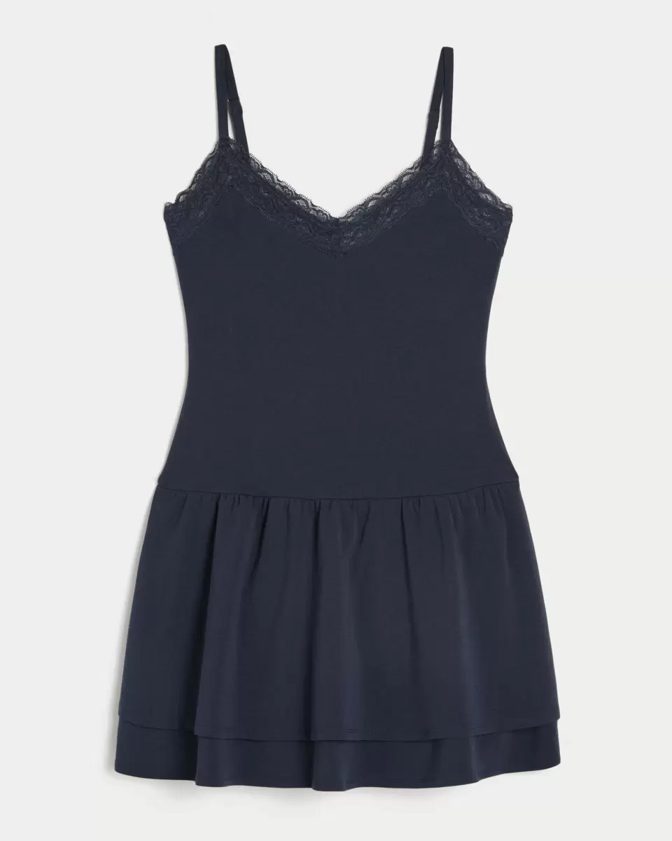 This pretty cami-style mini dress is made with soft knit fabric and features a tiered hem and lace trim along the neckline. Imported.