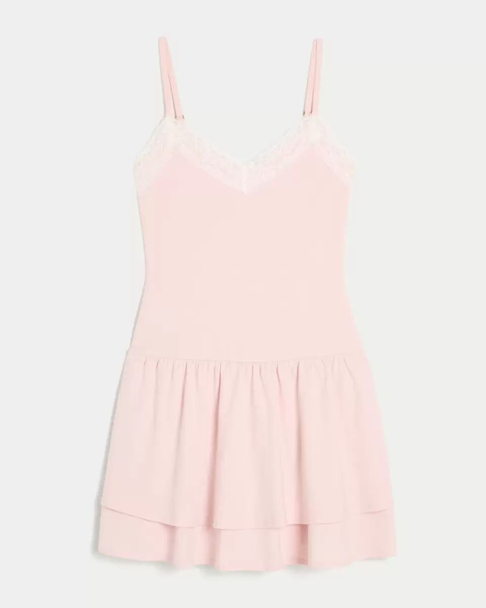 This pretty cami-style mini dress is made with soft knit fabric and features a tiered hem and lace trim along the neckline. Imported.