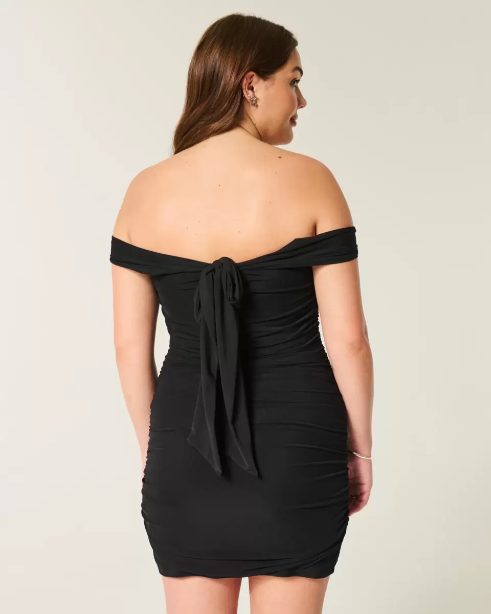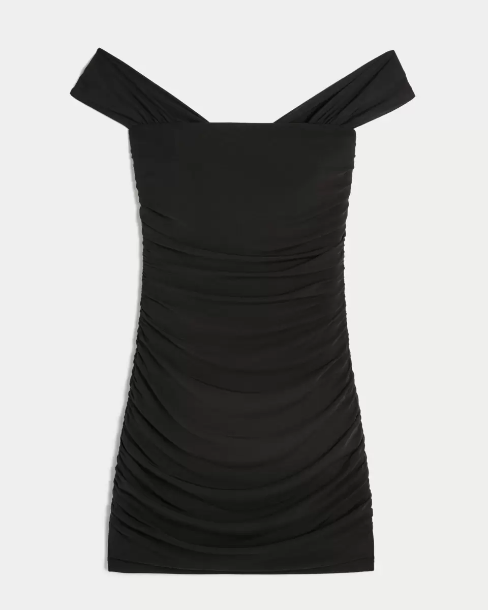 A pretty bodycon dress in soft mesh fabric, featuring cascading ruched detailing from top to bottom. Off-the-shoulder straps. Imported.