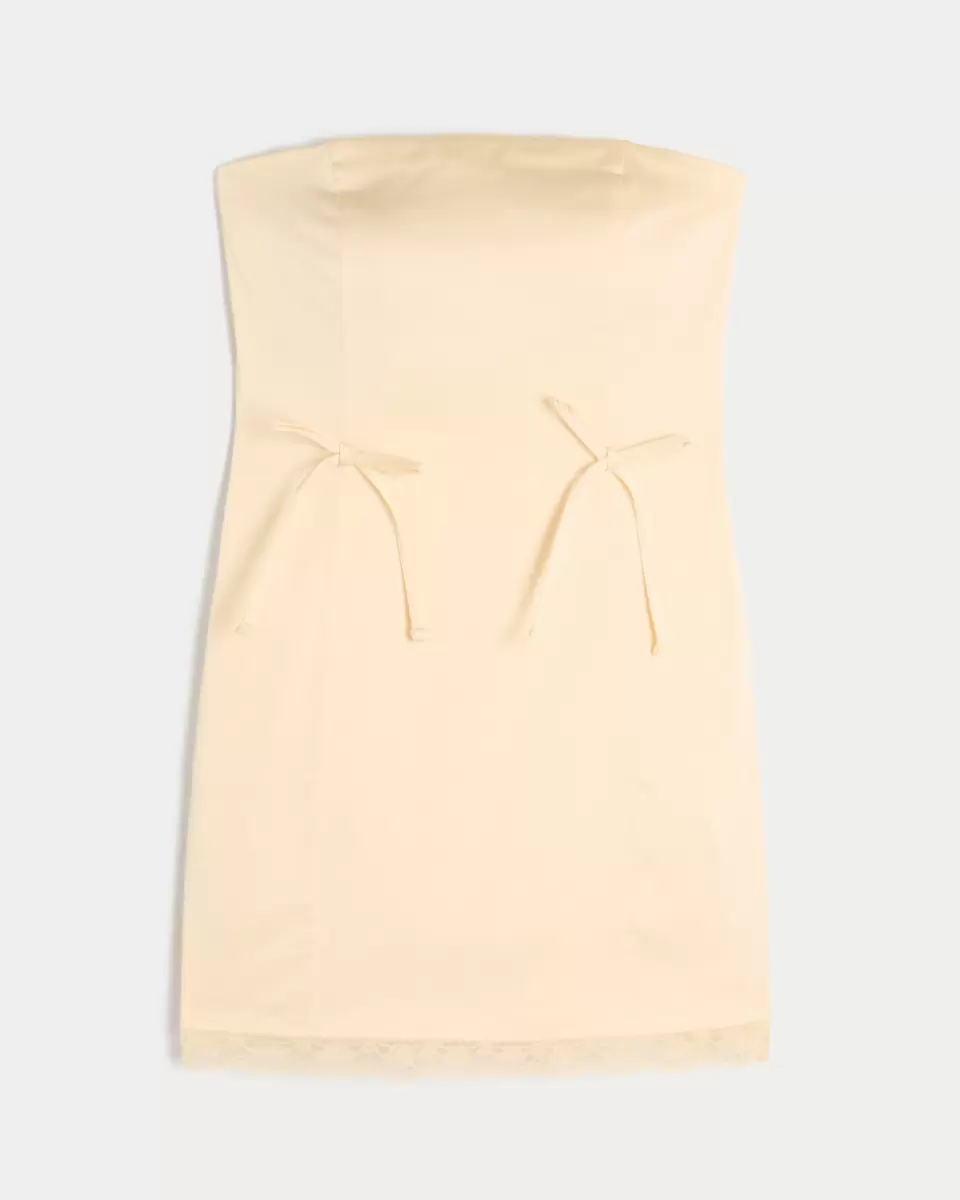 This super pretty dress is made with soft satin fabric and features bow details. Strapless, pretty lace trim at the hem.