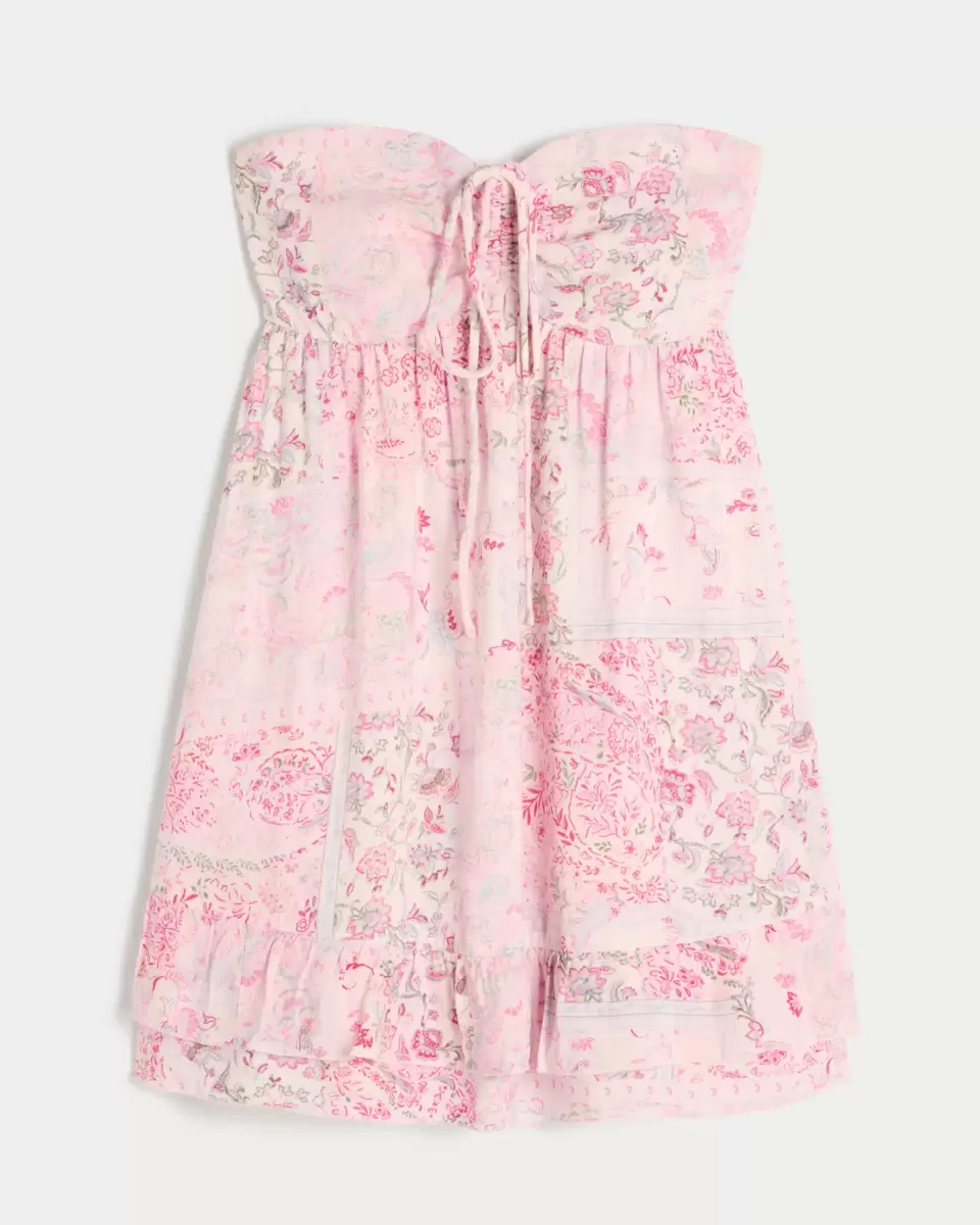 A flowy and super soft mini dress with a ruffled layered hem. Strapless, cinched with center tie at bust. Imported.