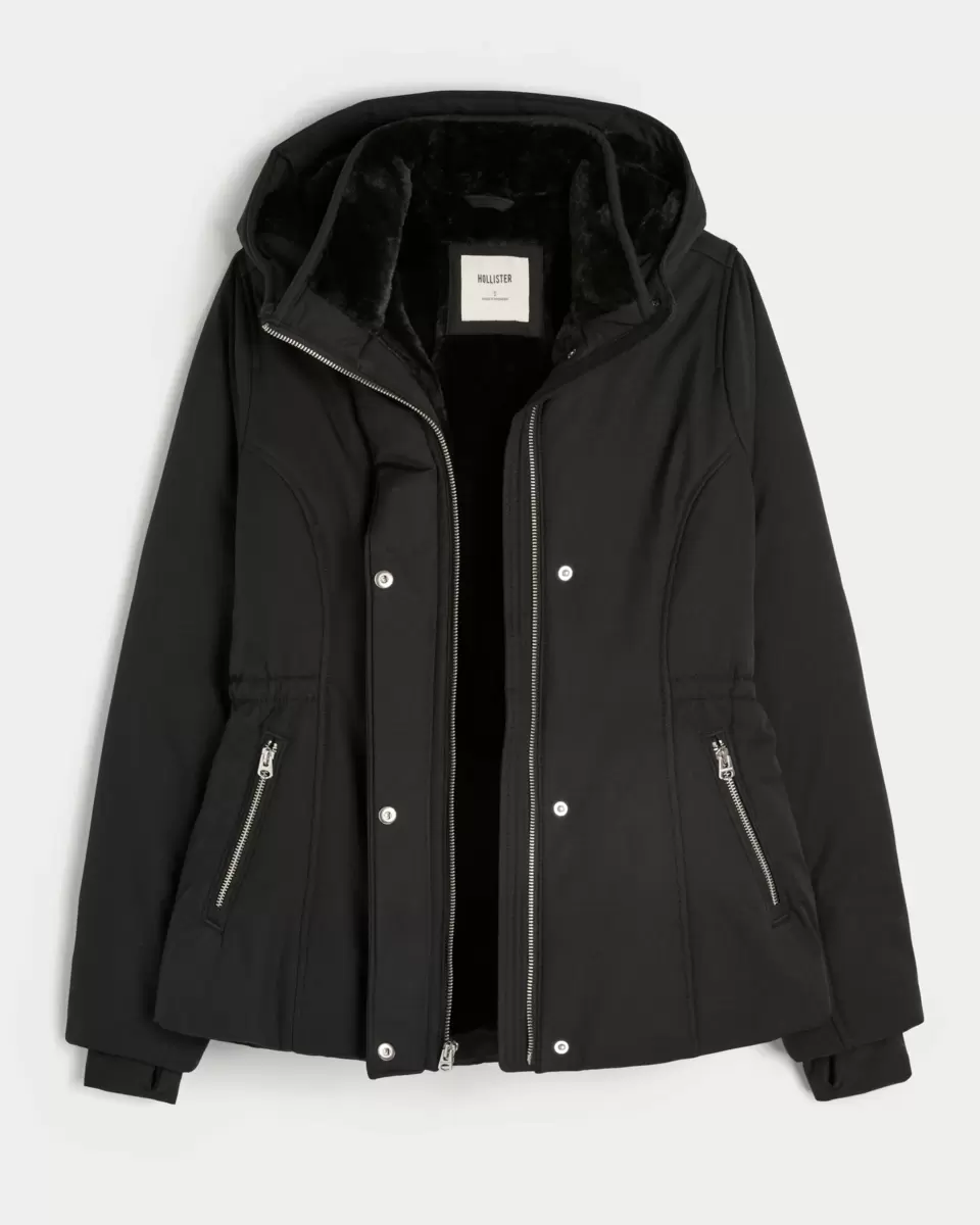 This super comfortable jacket features cozy faux fur lining, a full zipper closure with snaps and a faux fur-lined hood. Front zipper pockets, storm cuffs with thumb openings. Imported.