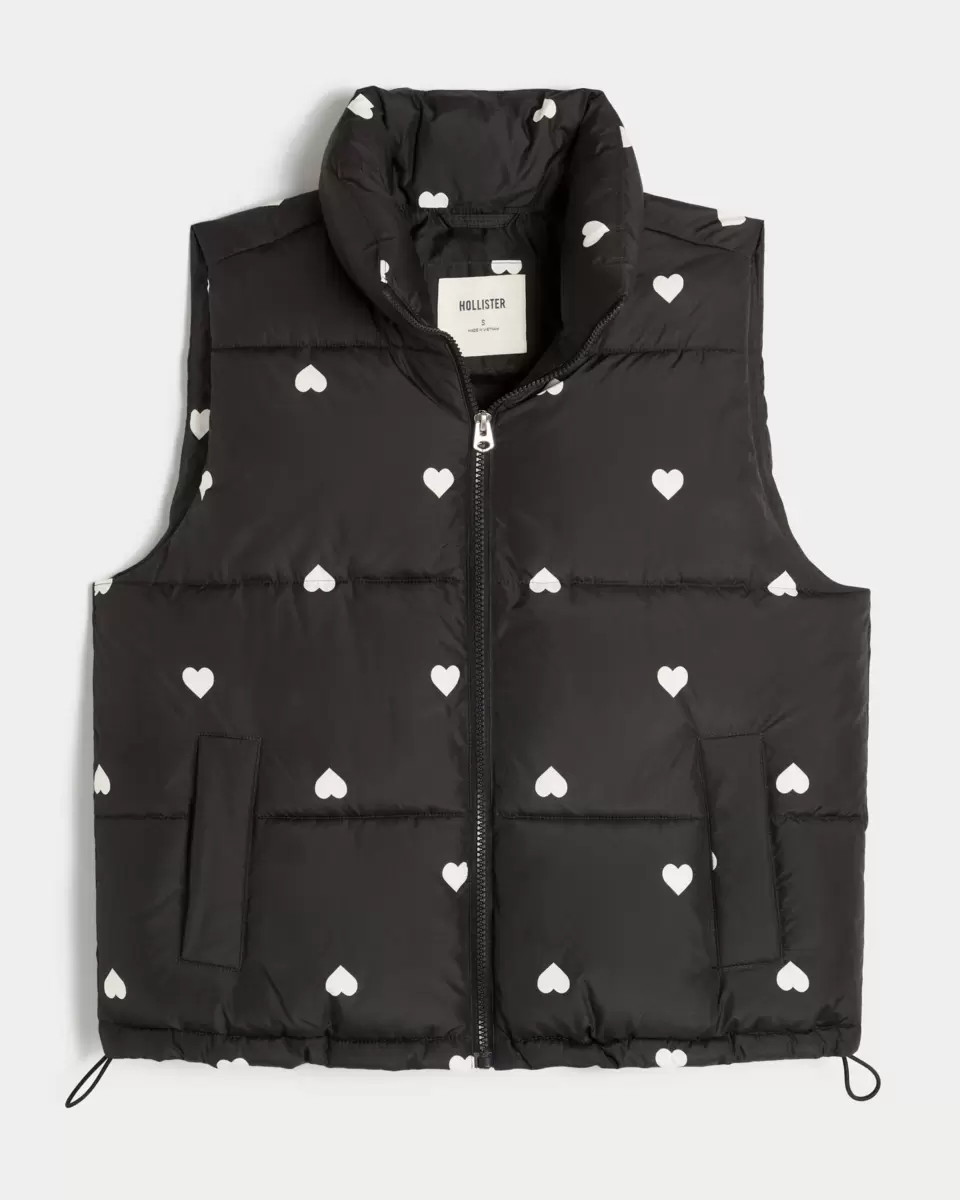 This cozy puffer vest features an all-over heart pattern and full zip-up closure. Drawcord hem, quilted channels, mock-neck collar, pockets. Imported.