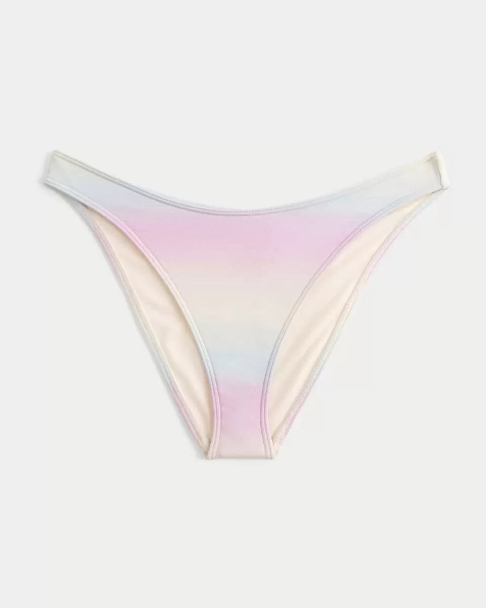A cute bikini bottom in soft swim fabric with shimmer and cheeky coverage. High-leg, mid-rise silhouette, ombre coloring. Imported.