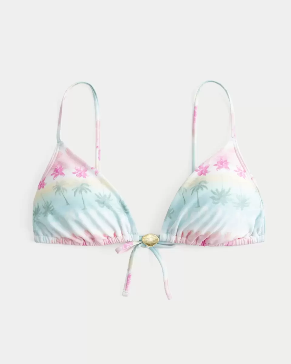 A cute bikini top in a triangle silhouette, featuring adjustable over-the-shoulder straps and a metal charm detail. Tie closure, removable padding. Imported.