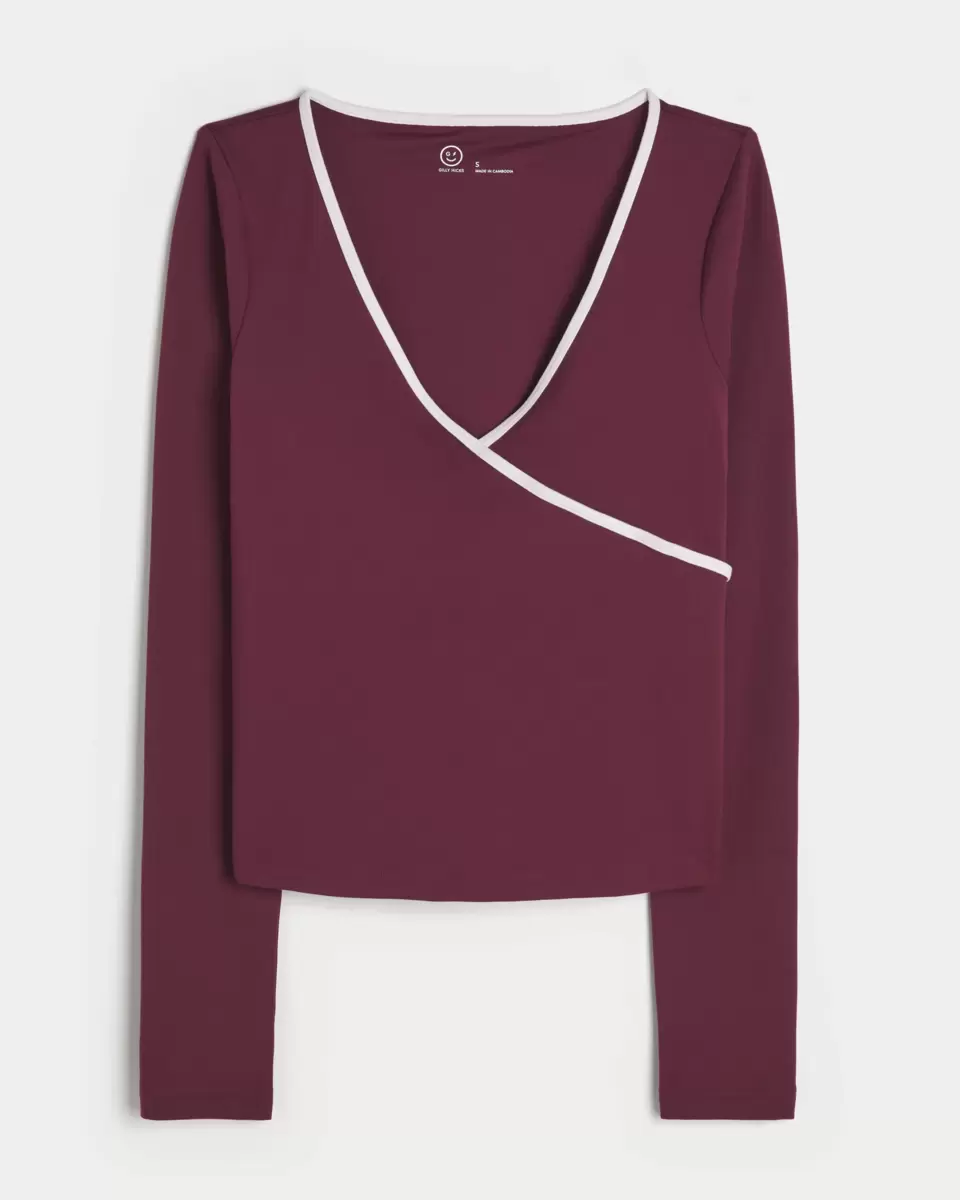 Cute and super soft, this active top features tipped trims and a wrap-style front detail. V-neckline, built-in shelf bra with removable pads. Imported.
