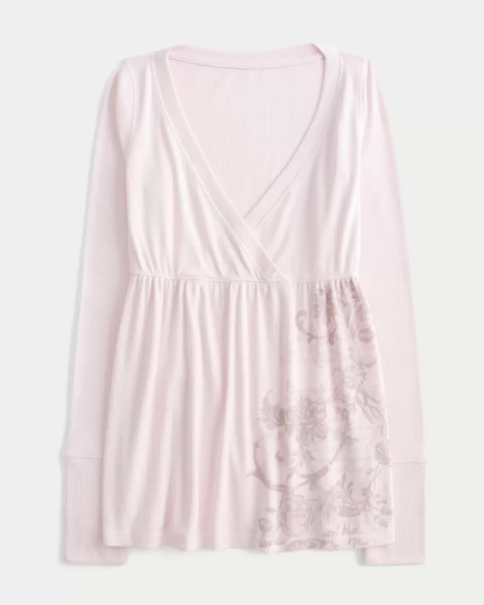 This cute, super soft babydoll top features a floral print graphic pattern. Long sleeves, wrap-style v-neckline, flowy hem. Easy Fit. Imported.