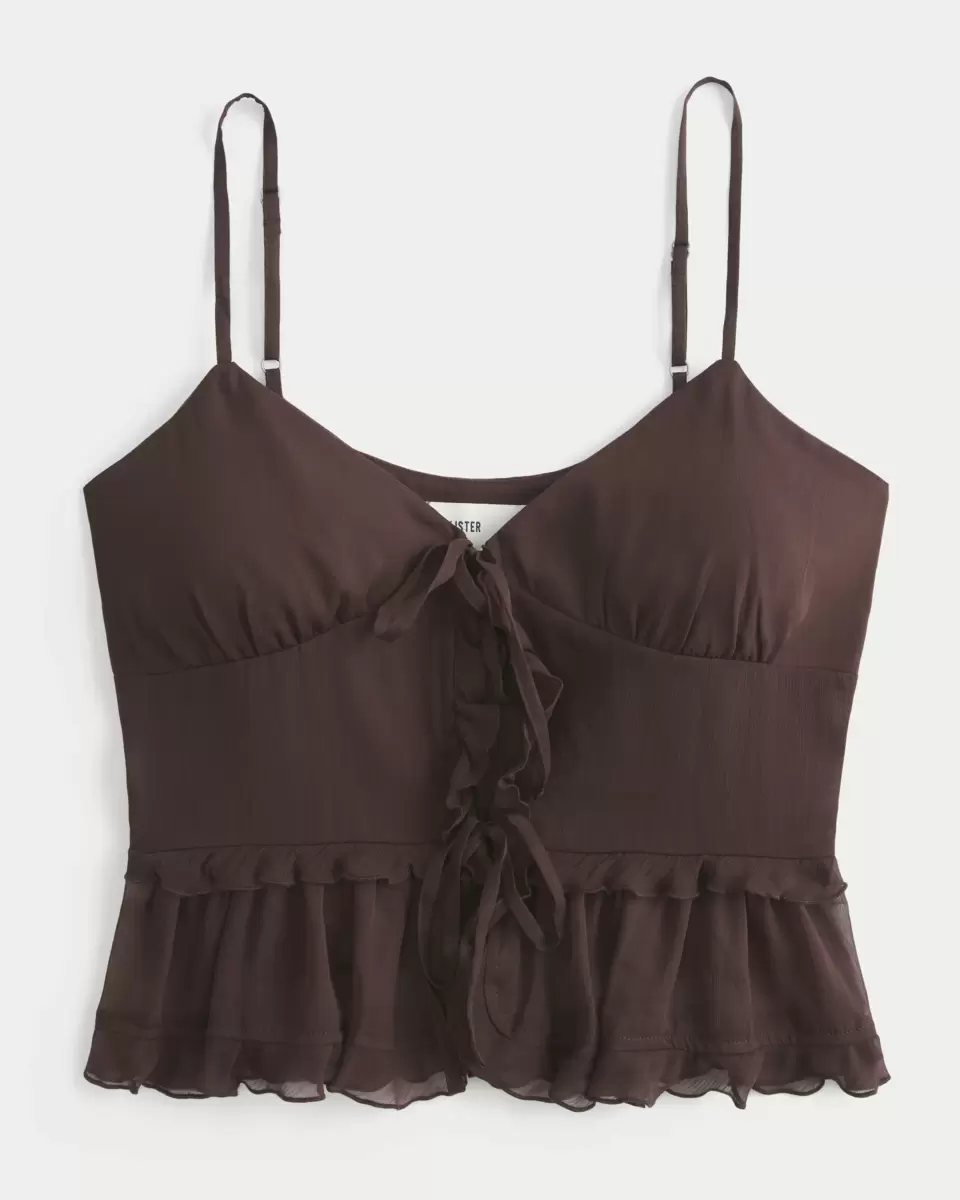 This pretty cami is made with super soft chiffon fabric and features ruffled details. Center tie detail, adjustable straps. Imported.
