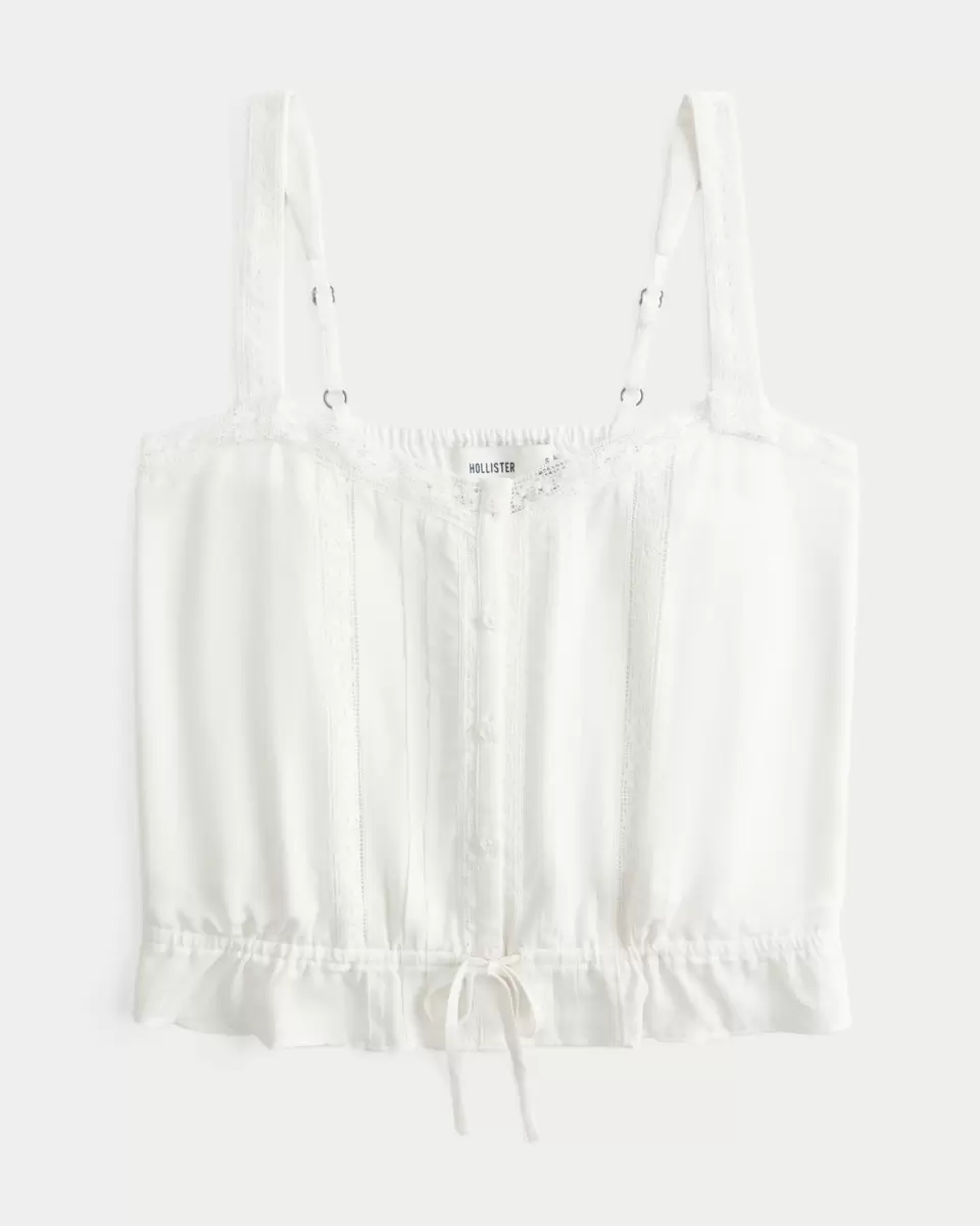 A pretty and super soft boho-inspired blouse with lace details, pintuck pleats and a cinched waist with tie. Adjustable straps, looks perfect dressed up or down!