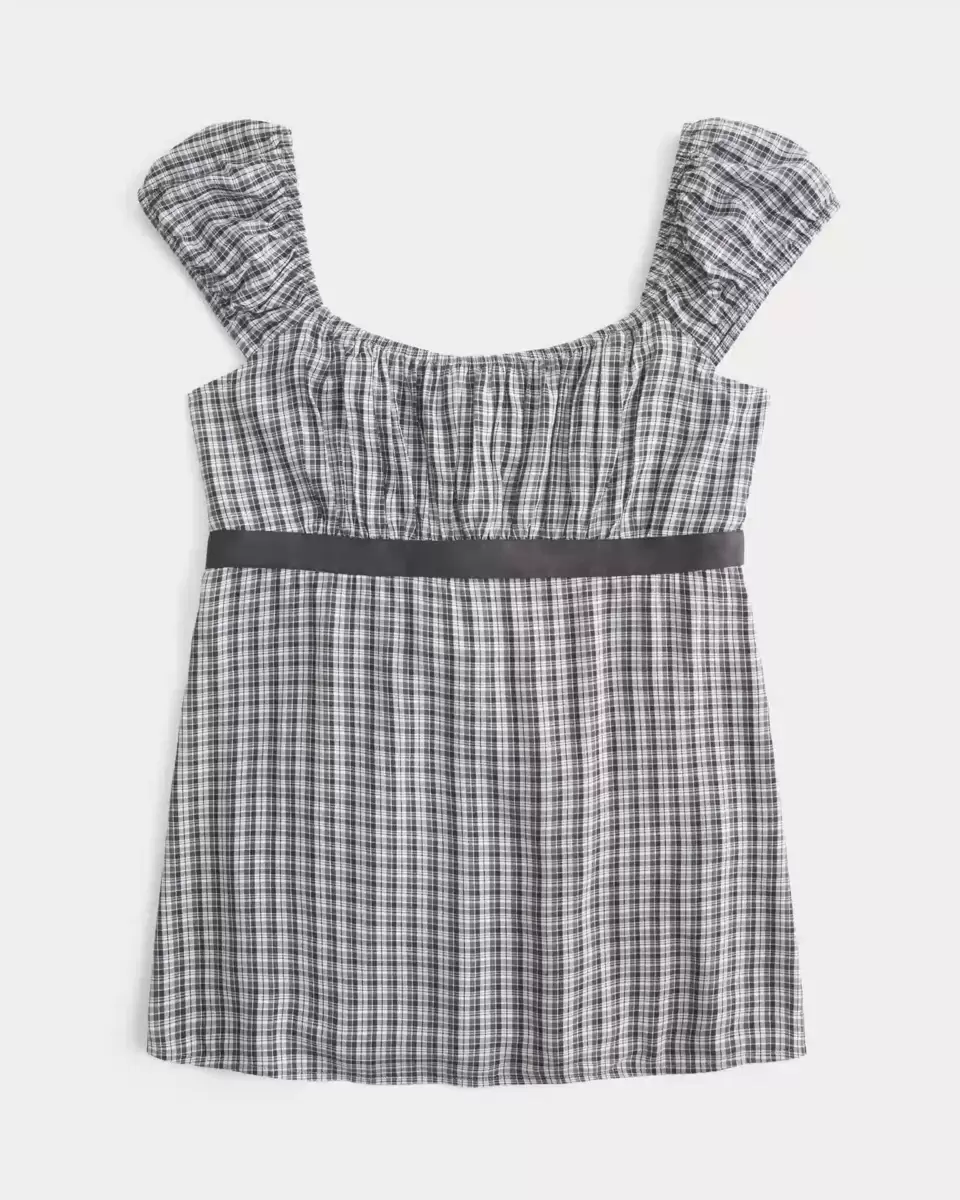 A pretty and super soft Y2K-inspired babydoll top featuring a satin tie detail at the waist and ruched detailing through the bust. Soft smocked back. Easy Fit. Imported.