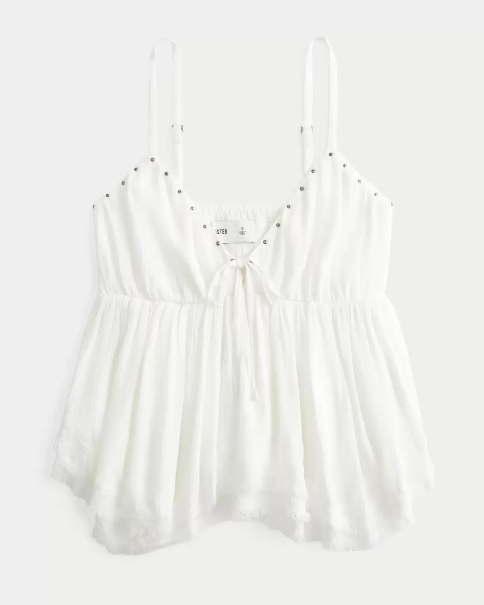 Flowy and super soft, this boho-inspired babydoll top features stud details along the neckline and a fringe hem. Soft smocked back, looks perfect dressed up or down! Easy Fit. Imported.