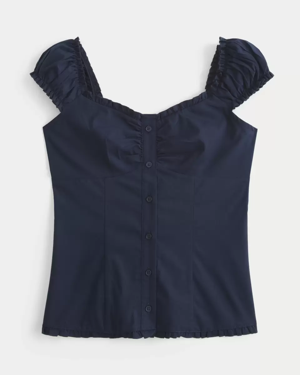 This cute top is made with soft, stretch poplin fabric and features a front button closure and ruffle details. Soft smocked back. Short cap sleeves can be worn on or off the shoulders, looks perfect dressed up or down! Slim Fit. Imported.