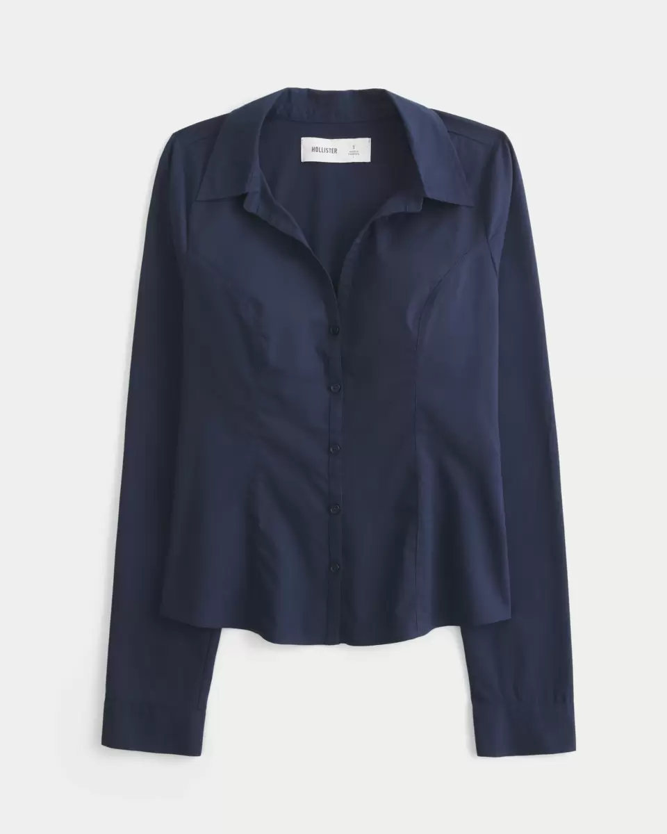 A Y2K-inspired long-sleeve stretch poplin shirt with a full button closure and seaming. Collar, adjustable back tie for the perfect fit. Looks perfect dressed up or down! Slim Fit. Imported.