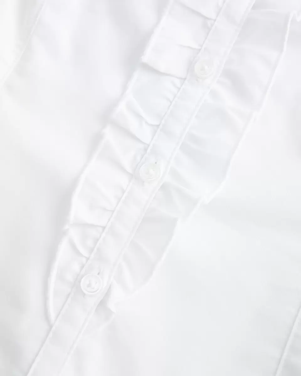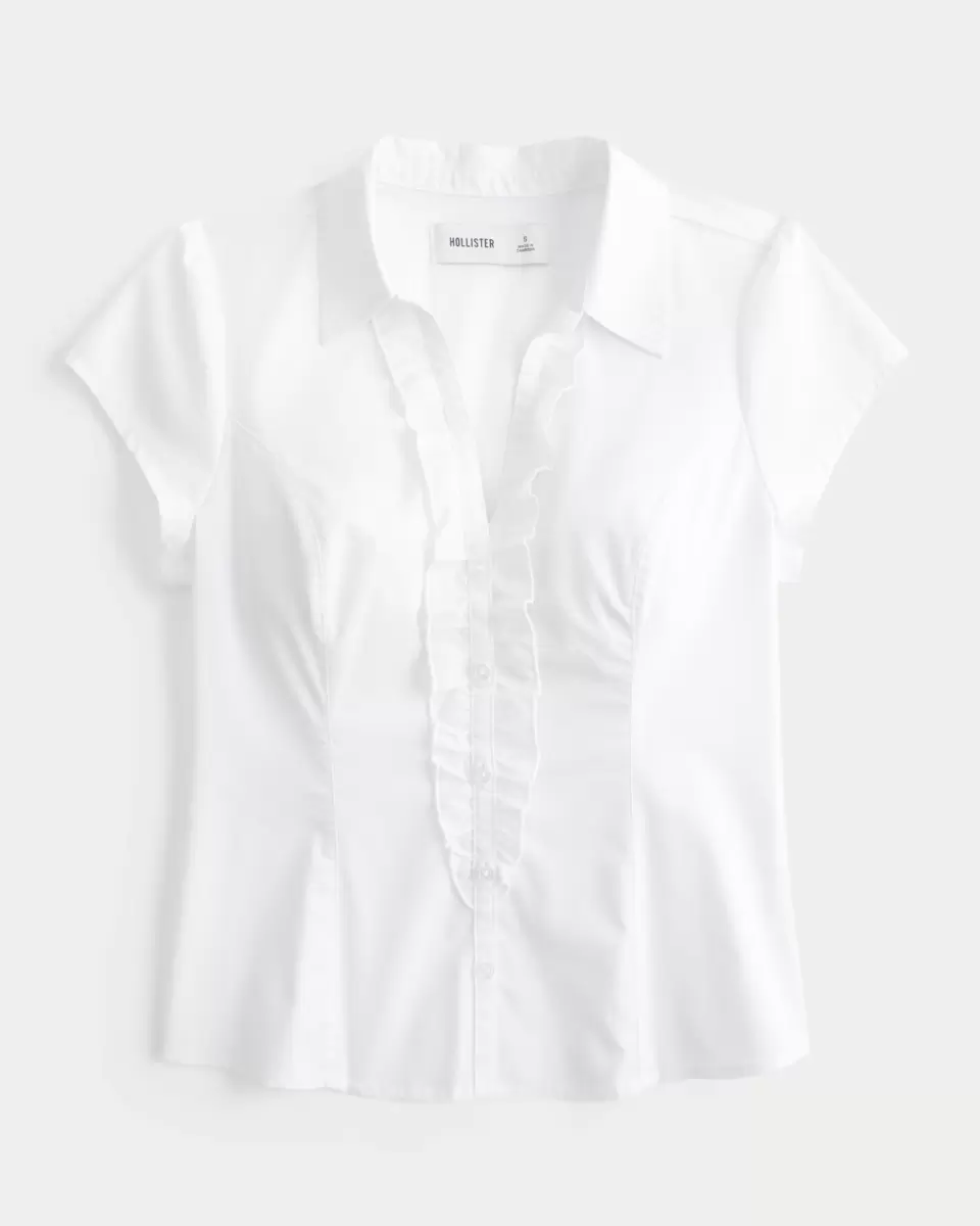 A soft, classic tuxedo-style short-sleeve shirt with ruffles along the front button closure. Collar, seam details for a tailored look. Slim Fit. Imported.